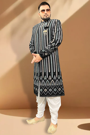 Black Color Velvet Fabric Wedding Wear Readymade Peshawari Style Indo Western For Men