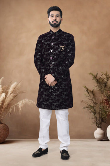 Wedding Wear Wine Velvet Attractive Readymade Indo Western For Men