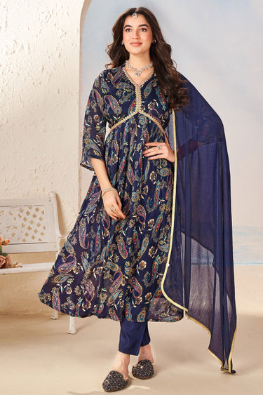 Navy Blue Color Printed Readymade Anarkali Salwar Kameez In Chinon Fabric