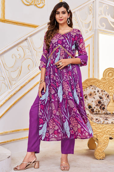 Purple Color Printed Readymade Anarkali Suit In Chinon Fabric