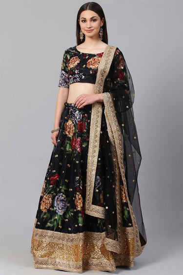 Function Wear Art Silk Fabric Black Color Floral Digital Printed Innovative Lehenga