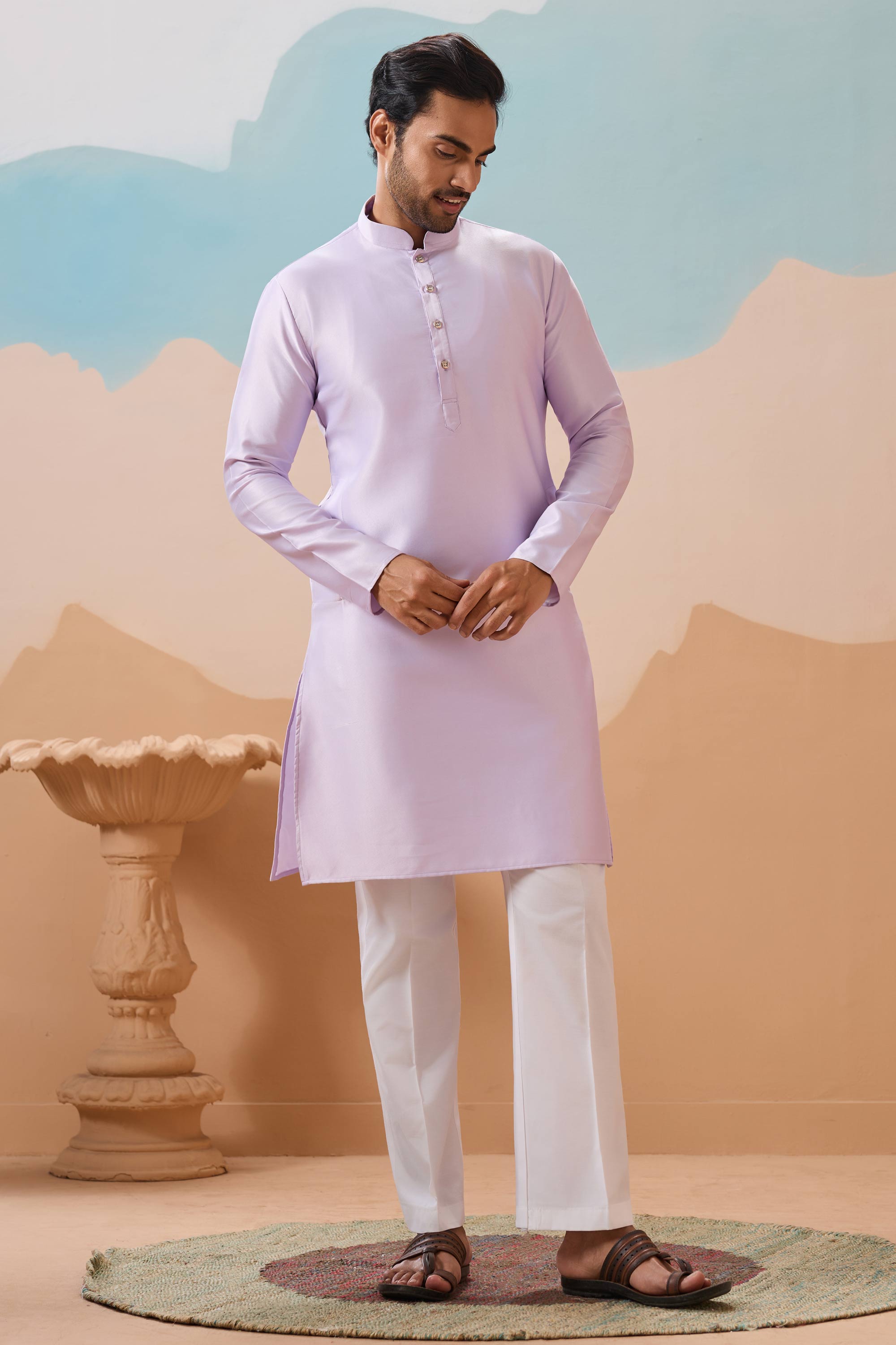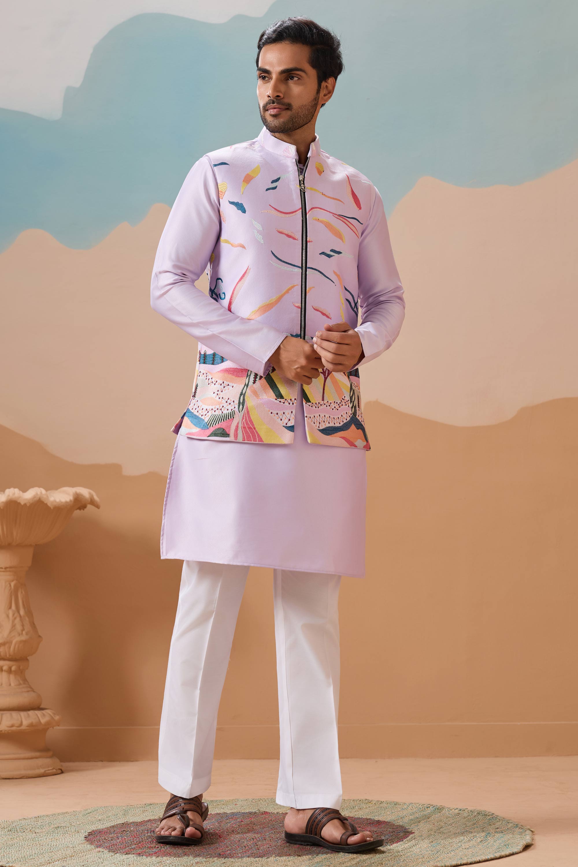 Mens Readymade Kurta Pyjama with Jacket Celebrate in style with this complete traditional outfit designed to add charm to any festive gathering. This ready to wear ensemble features a soft, high quality fabric that feels light yet looks striking. The stylish jacket adds the finishing touch to a timeless look suitable for weddings, receptions, or cultural events. Tailored with care, this outfit provides both comfort and sophistication without compromising on style. Perfect for those seeking effortless elegance and a sleek, put together look for all kinds of special occasions.