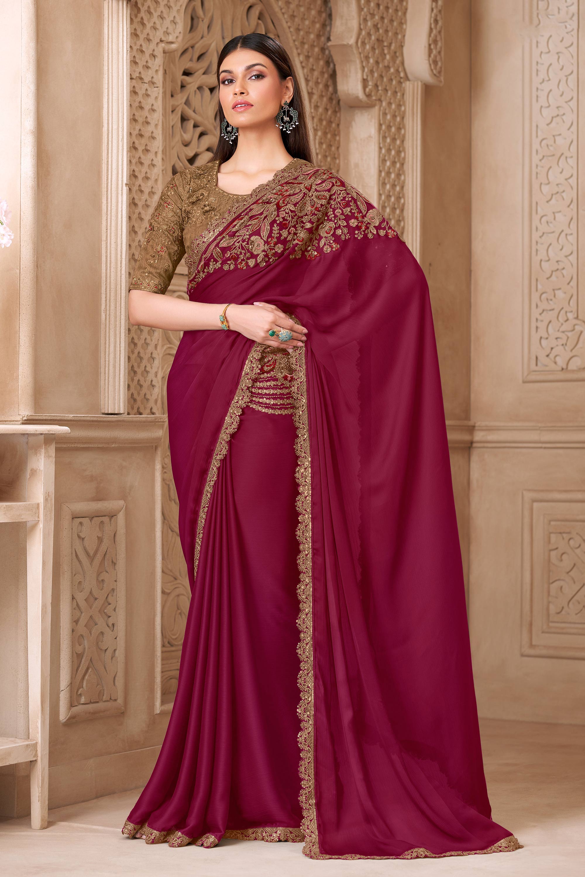 Art Silk Embroidered Maroon Saree For Party Wear