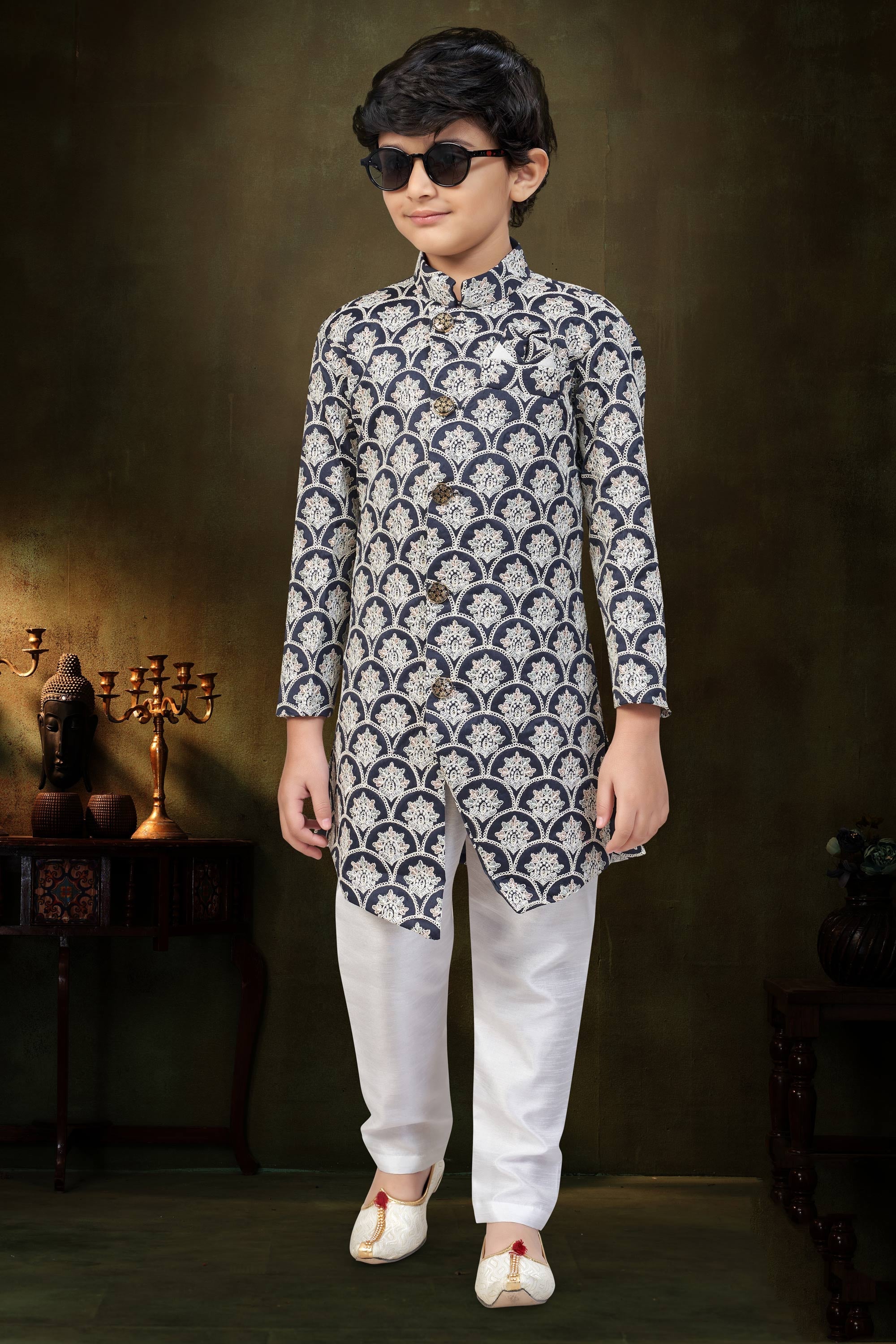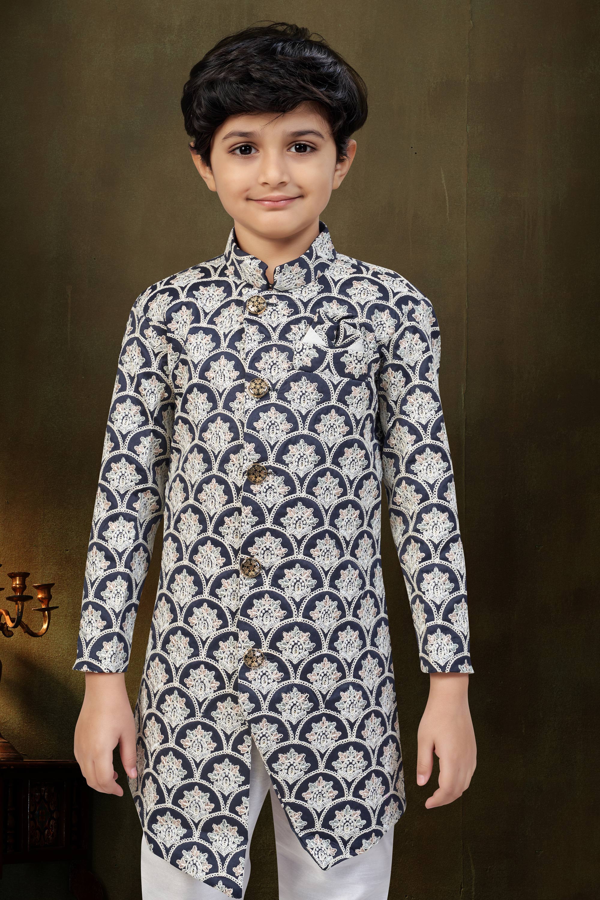 Art Silk Navy Blue Readymade Indo Western For Boys