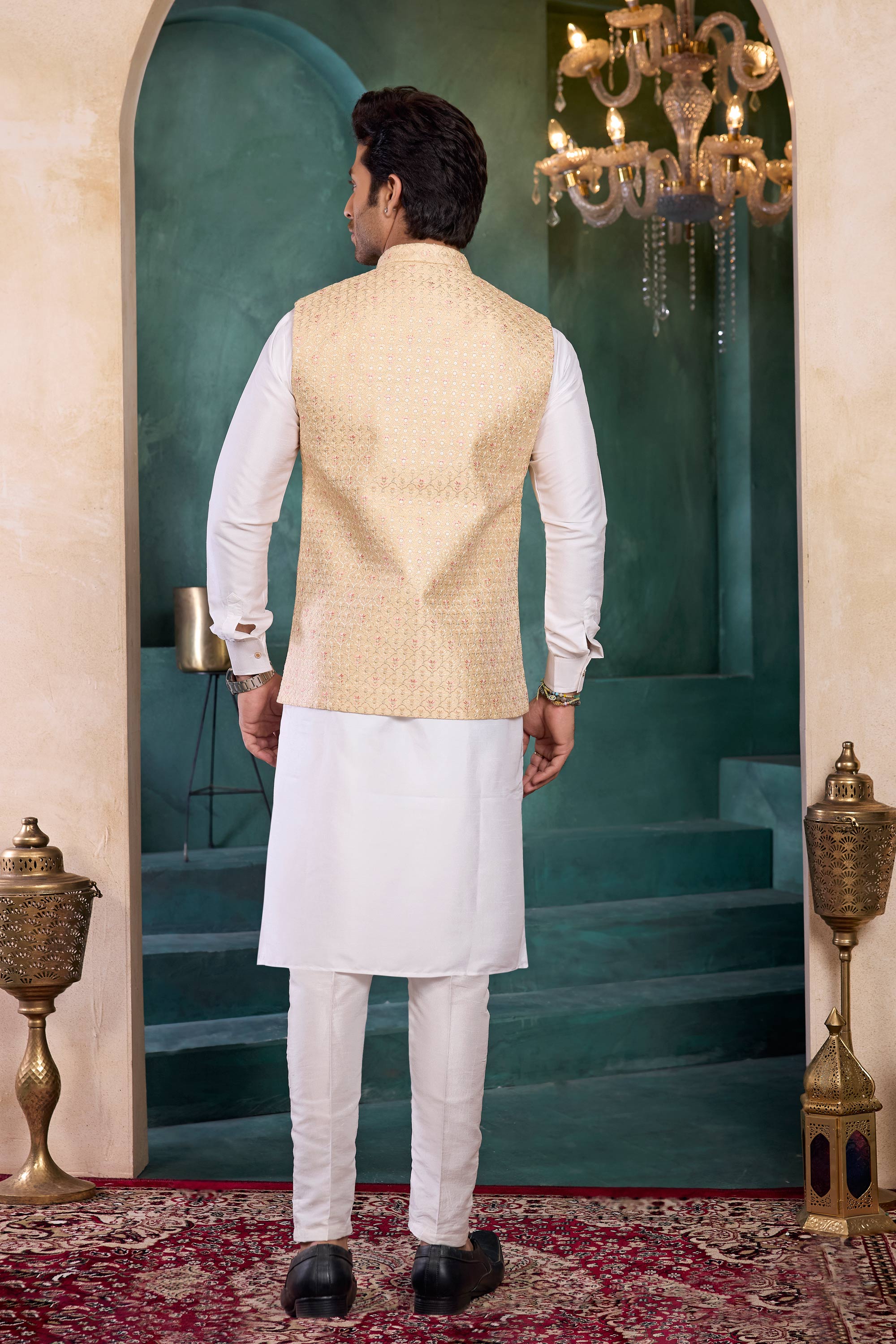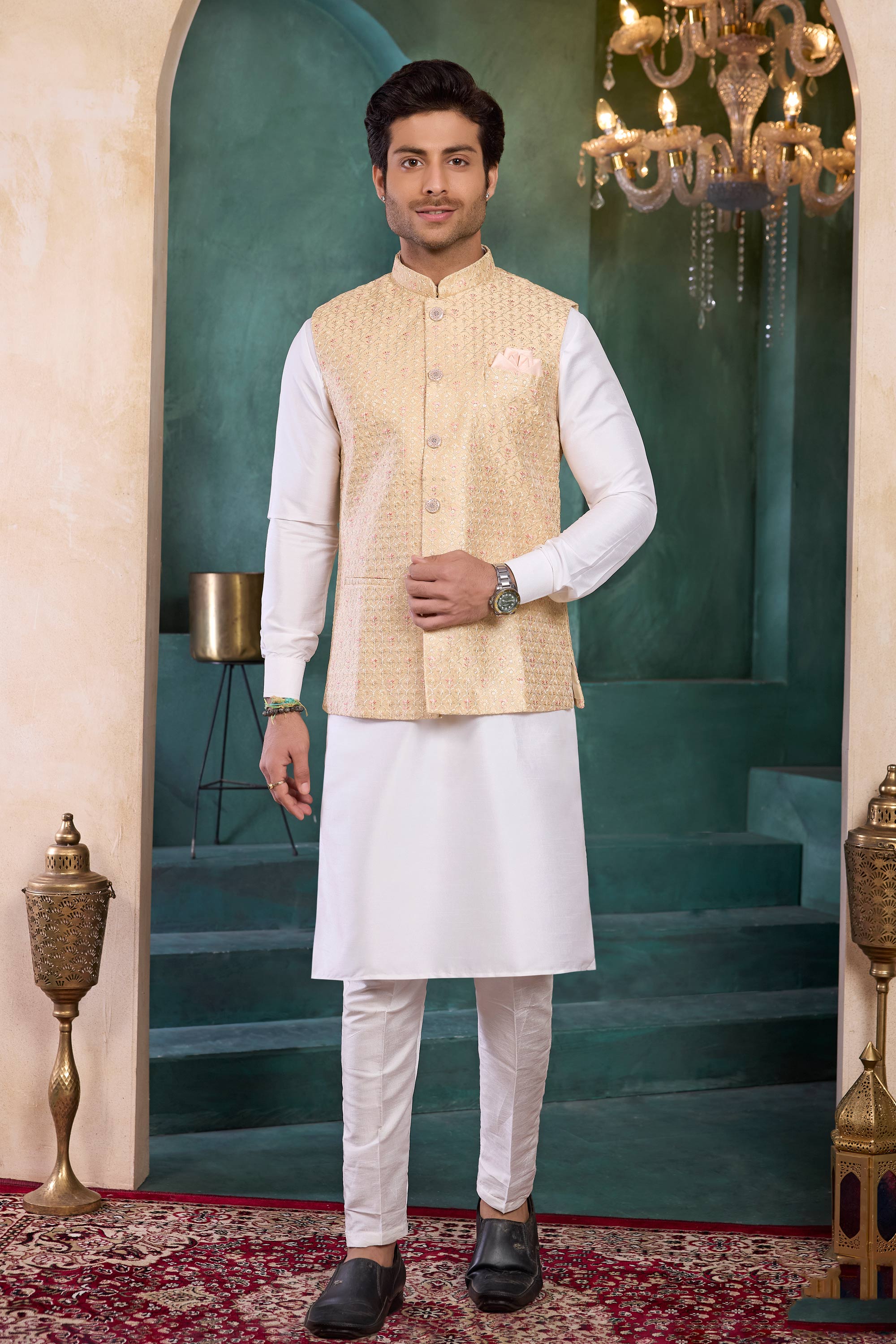 Turn heads with this exquisite Mens 3-Piece Kurta, Jacket, and Aligadhi Pant Set—ideal for wedding functions and festive gatherings. Designed for refined style, this readymade outfit offers a perfect blend of comfort and elegance. The detailed jacket adds a sophisticated flair, while the Aligadhi pant and kurta combination creates a seamless, polished look. Whether its a cultural event or a joyous celebration, this outfit ensures youre dressed to impress without compromising on ease and practicality. With its attention to craftsmanship and versatility, it's a must-have addition to any man's wardrobe.