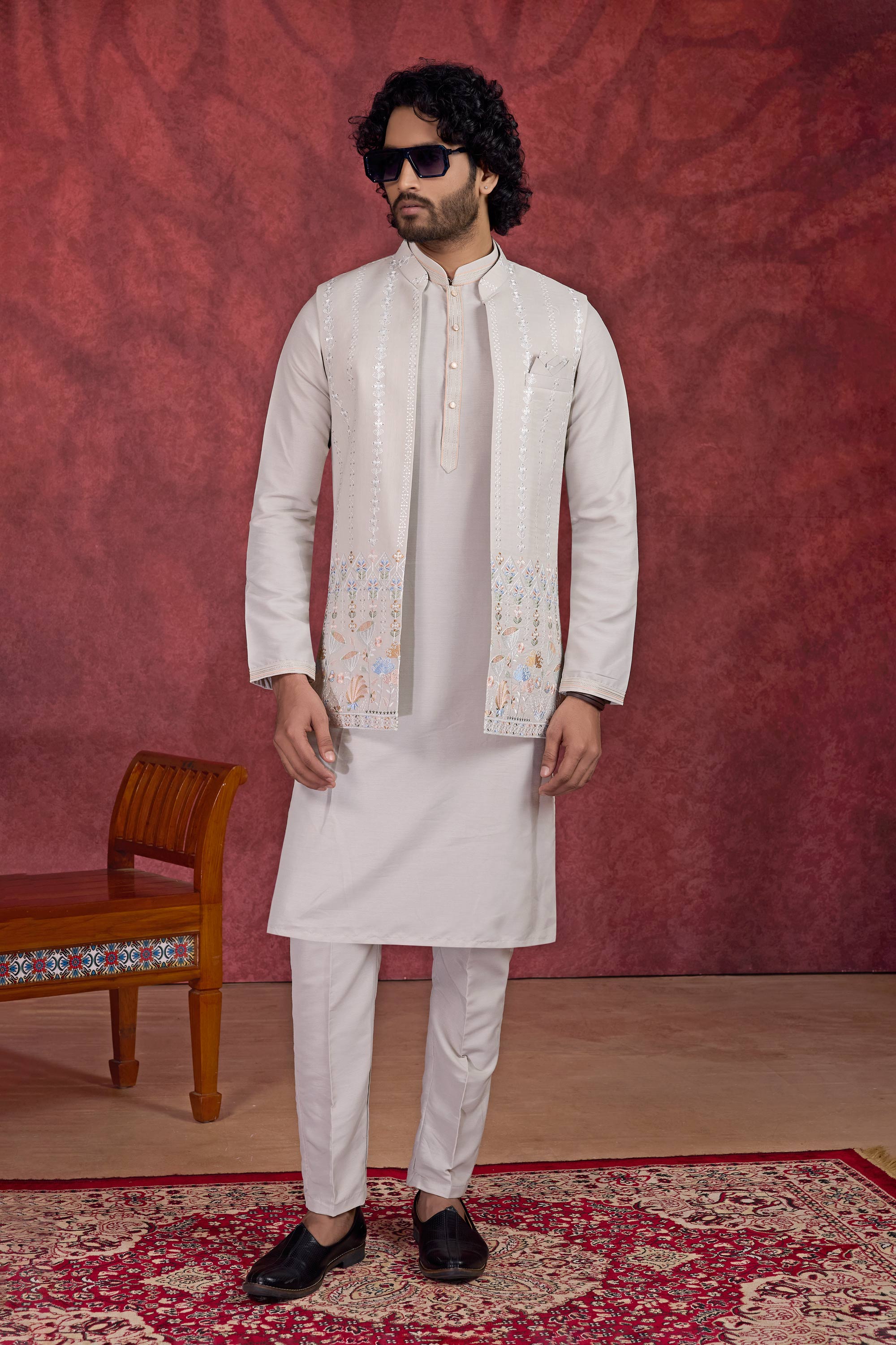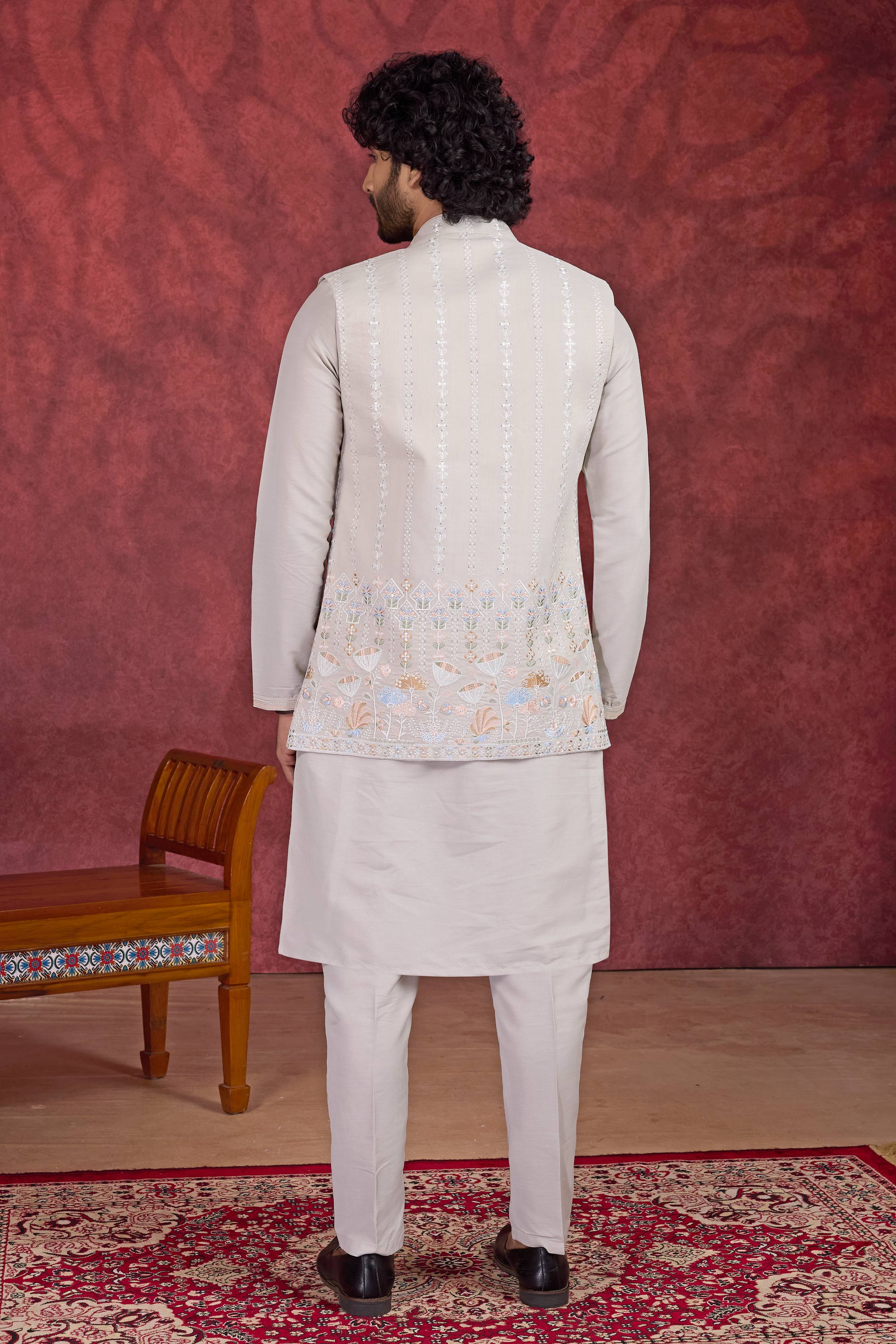 Grey Art Silk Fabric Readymade Kurta And Aligadhi Pant With Embroidered Jacket For Men