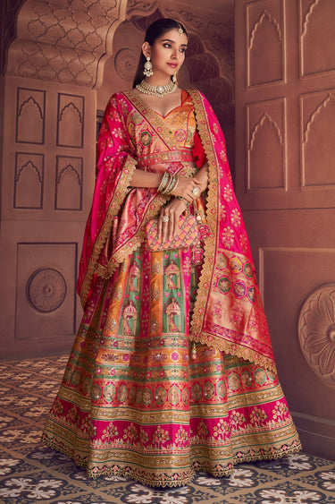 Step into elegance with this Heavy Weaving Work Multi Color Bridal Lehenga Choli made with high-quality Banarasi silk fabric. This bridal outfit stands out with its artistic weaving work and eye-catching color combinations. Perfectly suited for weddings and grand celebrations, the lehenga offers a comfortable yet stylish fit. The lightweight silk fabric provides breathability while maintaining a luxurious appearance. Its coordinated choli and dupatta bring a balanced yet striking look to your overall ensemble. This stunning piece seamlessly blends tradition with sophistication, ensuring you shine on your big day or at any festive occasion.