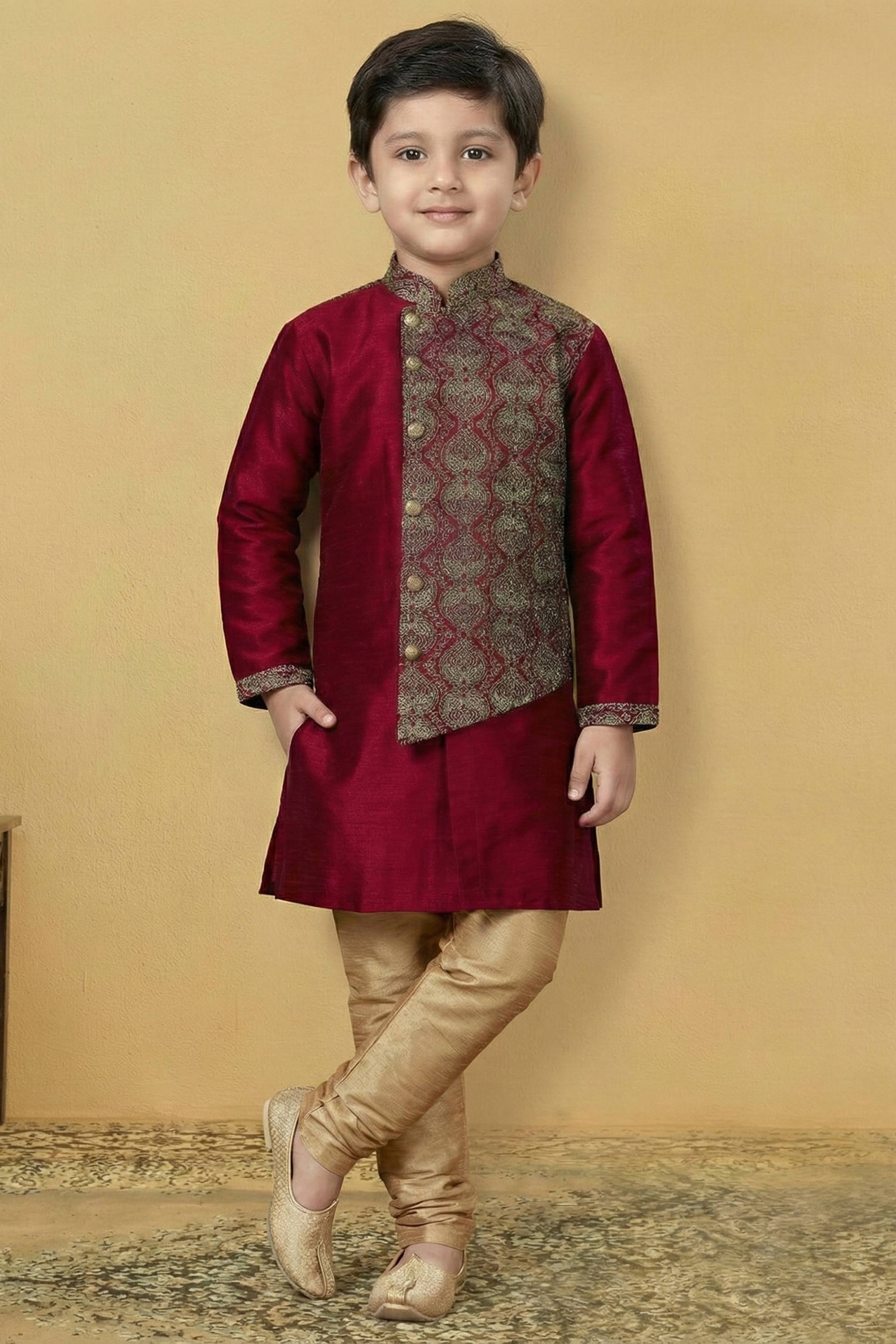 Maroon Art Silk Fabric Boys Readymade Kurta Pyjama For Sangeet Wear