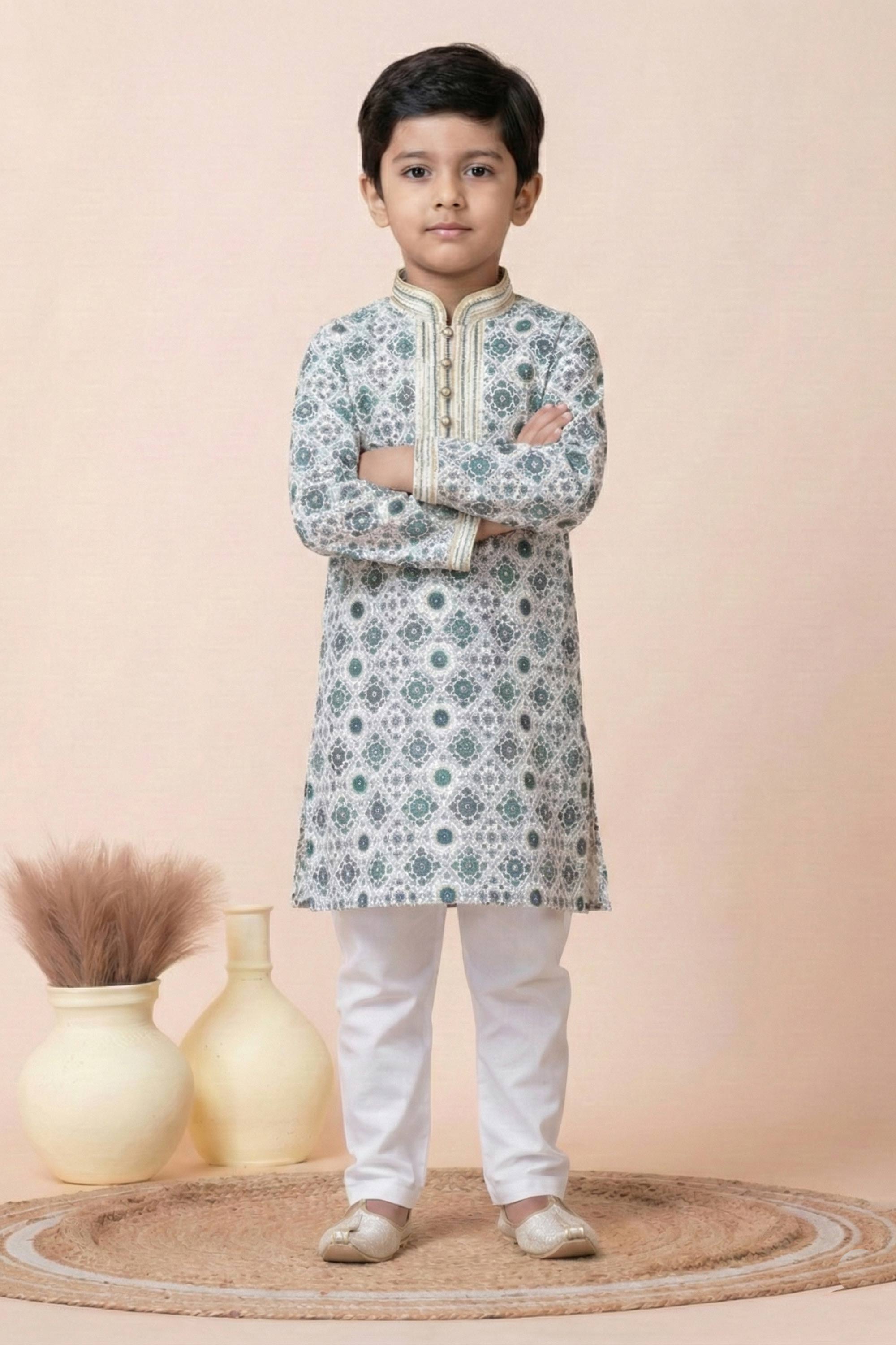 Enhance your childs wardrobe with the Appealing Reach Color Function Wear Designer Readymade Kurta Pyjama For Boys, designed to impress at every festive and family gathering. Made from fine-quality material, this kurta-pyjama set combines comfort and durability, ensuring it stays a favorite for multiple occasions. Its modern design blends effortlessly with traditional charm, making it suitable for various events. The lightweight and breathable fabric allow ease of movement while keeping your child looking elegant and presentable. A hassle-free wear design ensures less time getting ready and more time enjoying the festivities. This stylish ensemble is perfect for gifting, too.