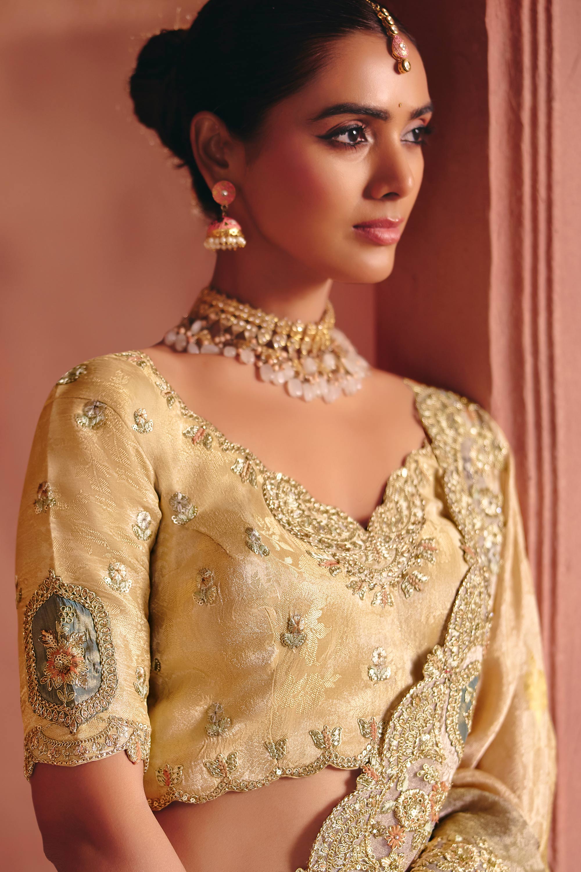 Beige Wedding Wear Jacquard Fabric Embroidered Saree