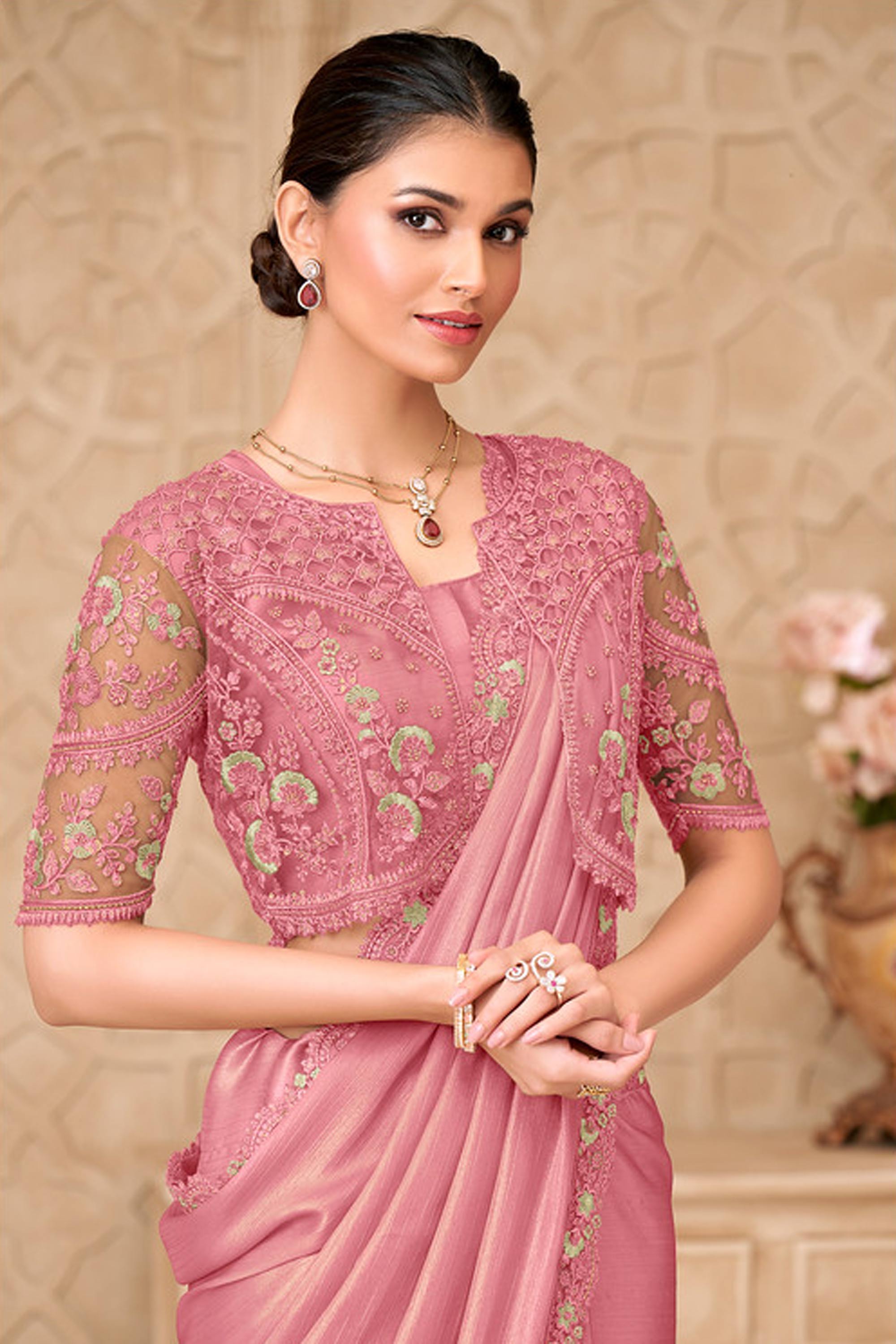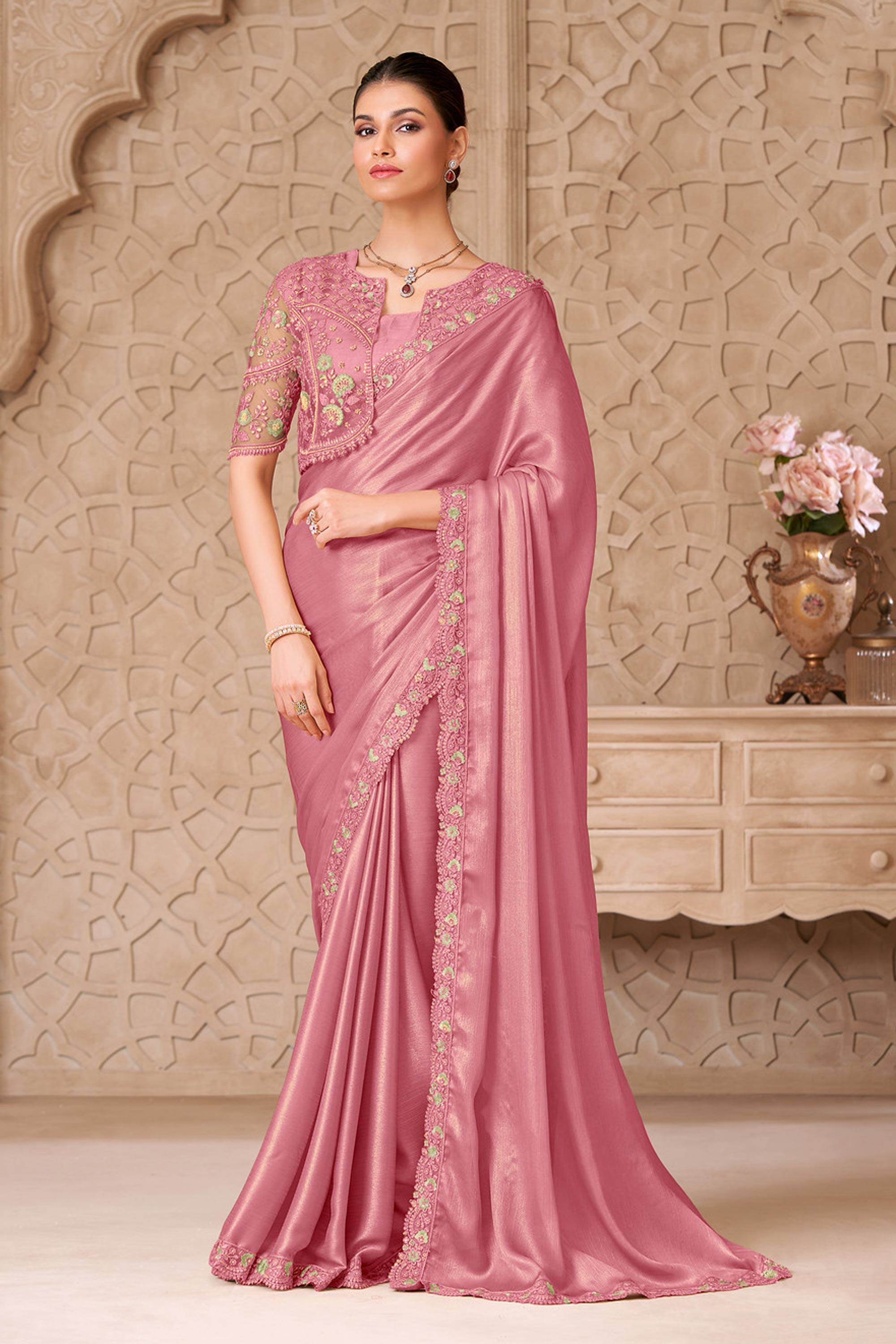 Georgette Satin Lace Border Work Pink Saree For Wedding Wear