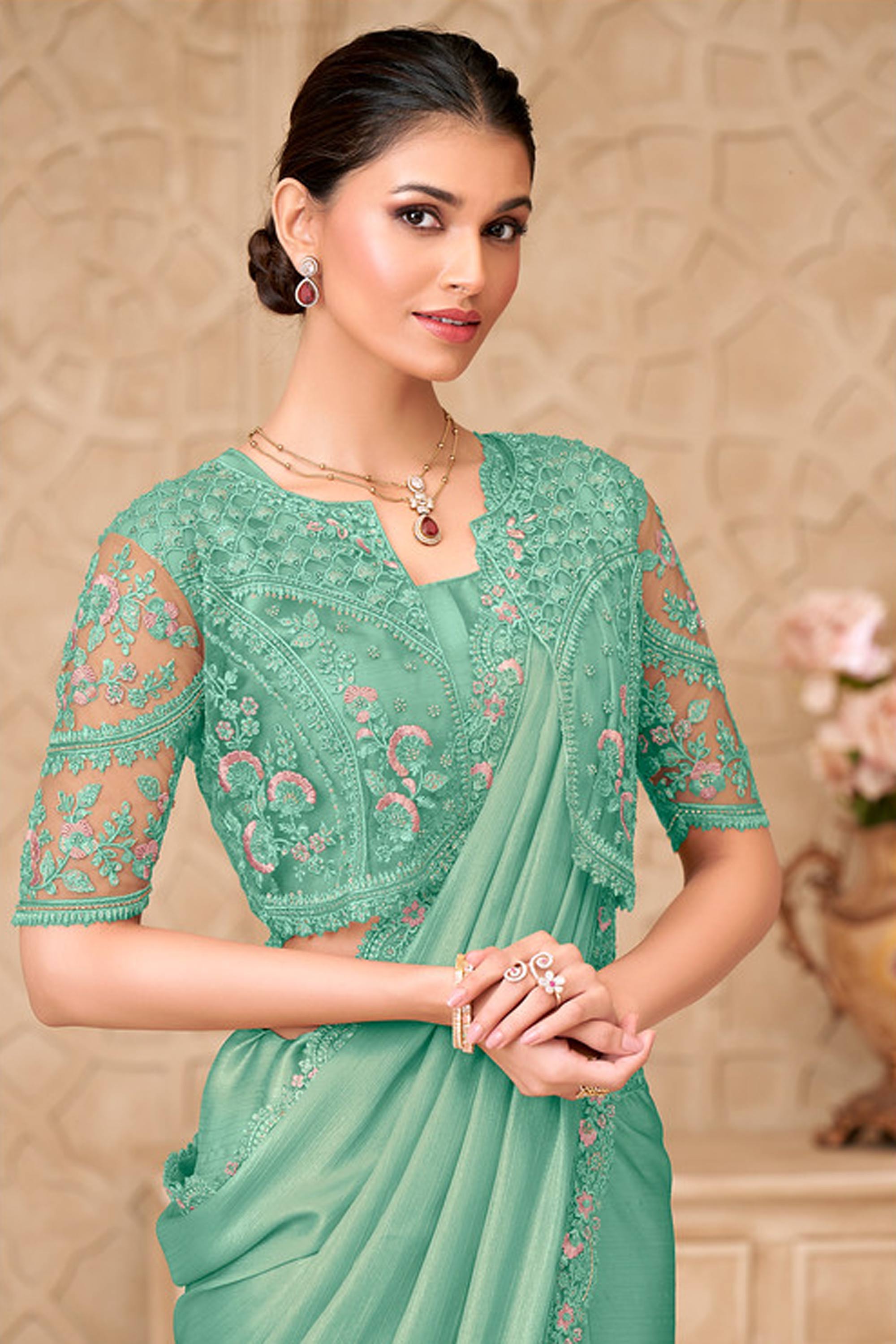 Lace Border Work Georgette Satin Sea Green Wedding Wear Saree