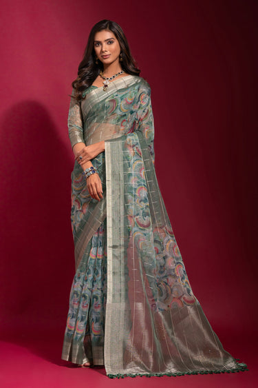 Pure Linen Zari Pattern Checks Sea Green Printed Saree