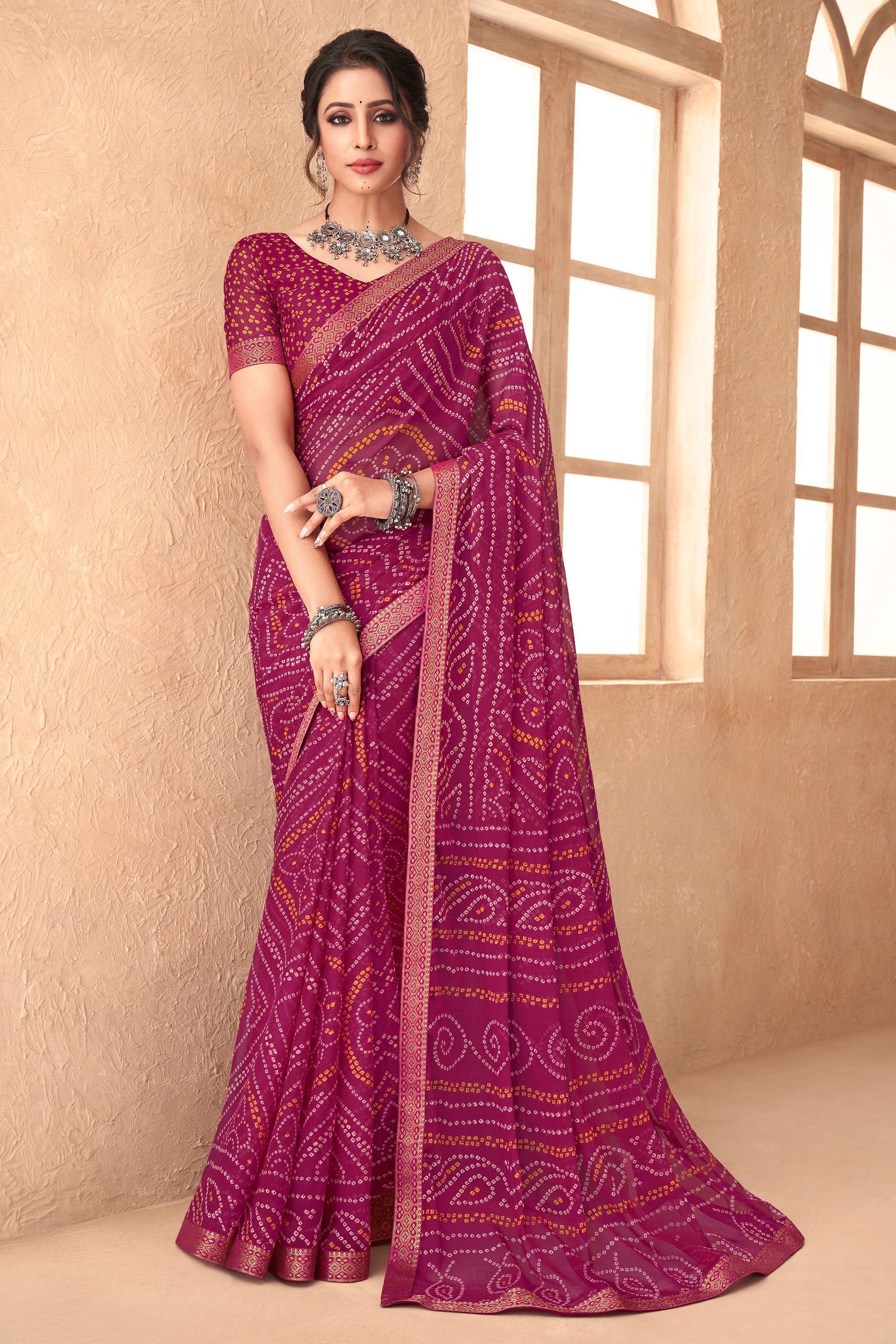 Turn your everyday moments into special ones with this beautifully designed Bandhani Print Saree. Featuring an attached Banarasi border, this chiffon saree brings a traditional feel with modern flair. It comes with matching blouse material, allowing you to customize your fit and look. Ideal for casual occasions, it offers lightweight fabric for all-day wear without compromising on style. Whether you're heading to work or running errands, this saree combines tradition with functionality to keep you comfortable and elegant.