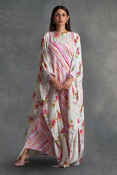 Exclusive Pink Color Crepe Printed Function Wear Trendy Dress With Cape Set