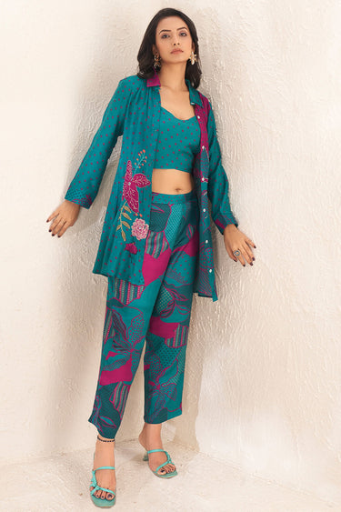 Exclusive Teal Blue Sequins 3 Piece Co Ord Set With Camisole