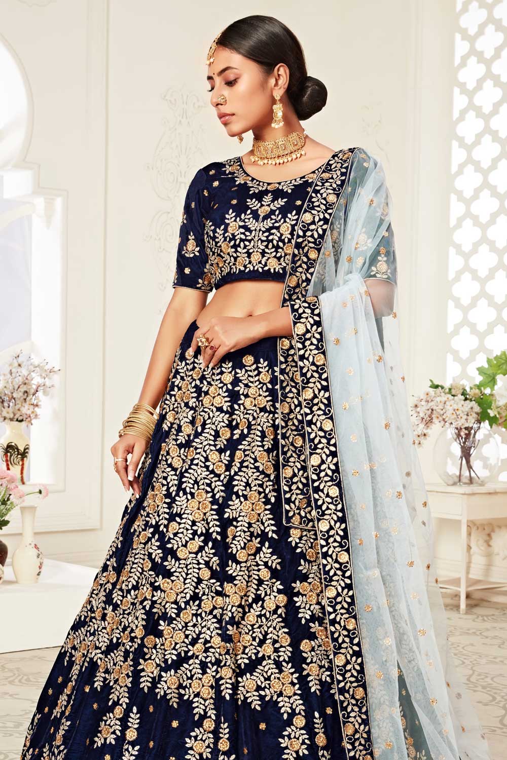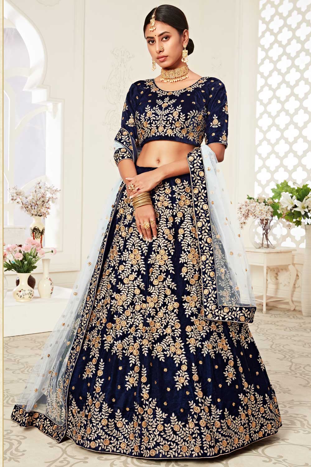 Navy Blue Color Velvet Fabric Engaging Lehenga With Sequins Work