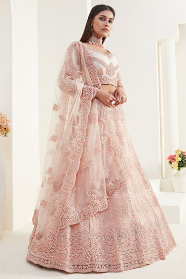 Net Fabric Peach Color Beatific Look Sangeet Wear Designer Lehenga