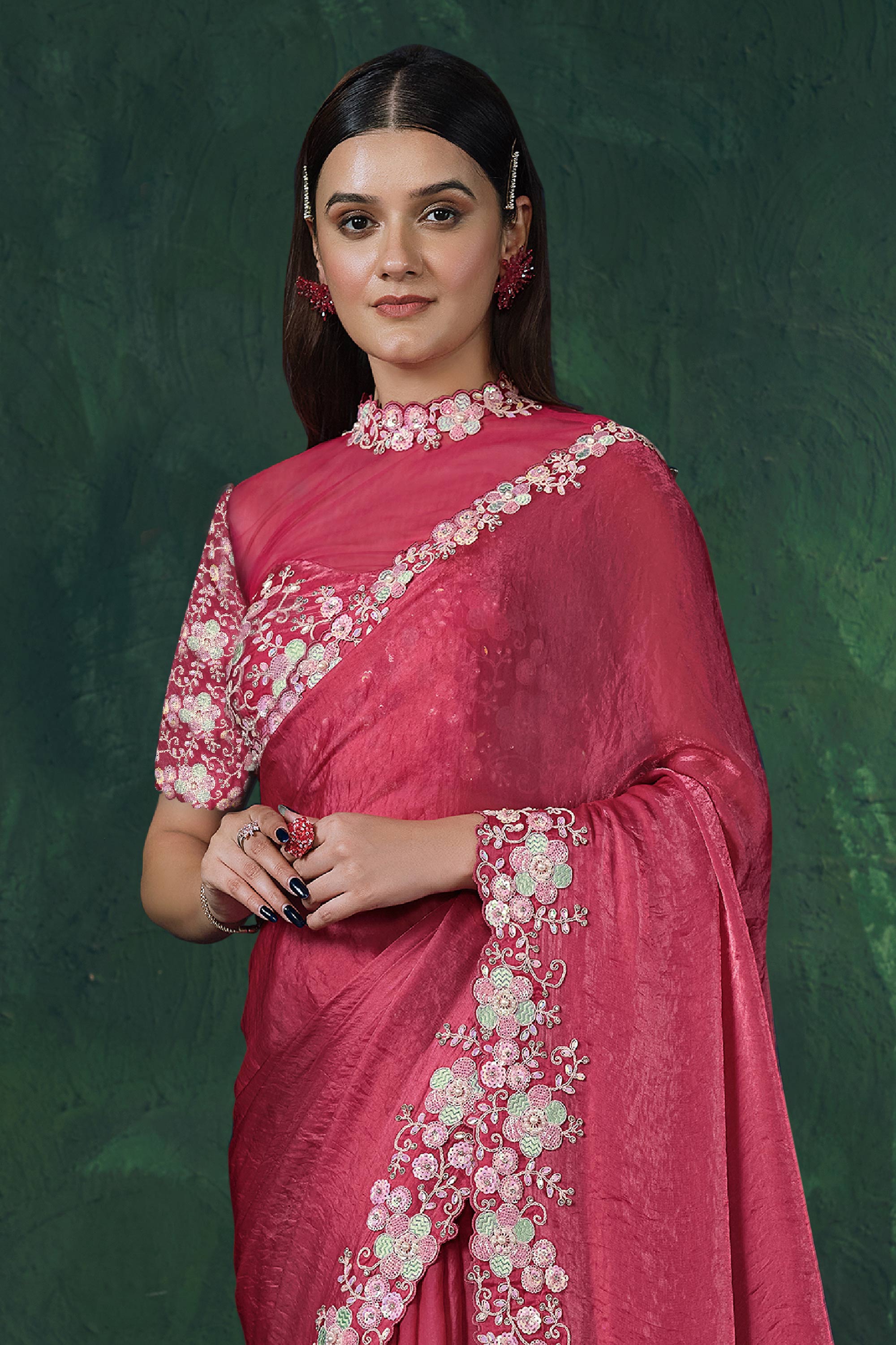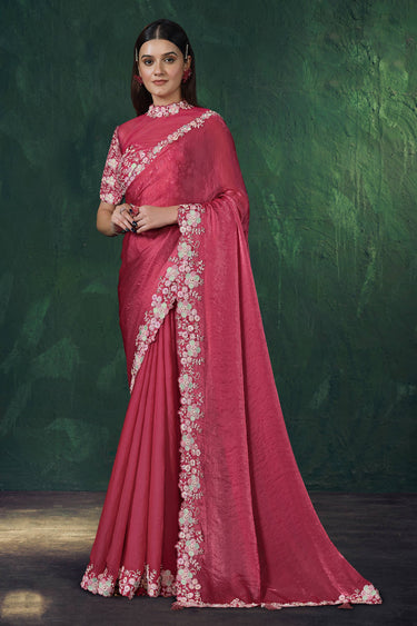Satin Silk Embroidered Border Work Pink Readymade Saree For Wedding Wear