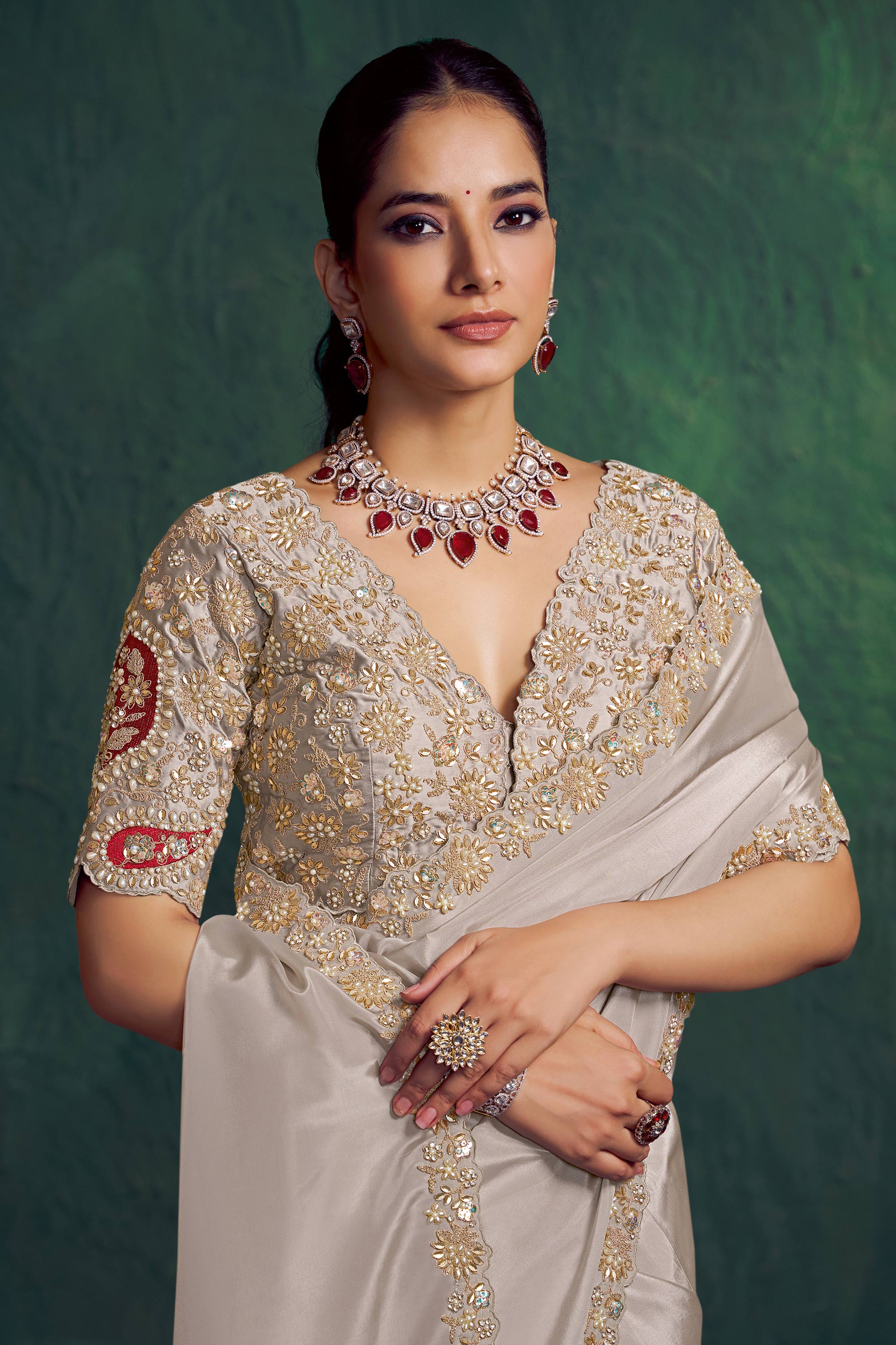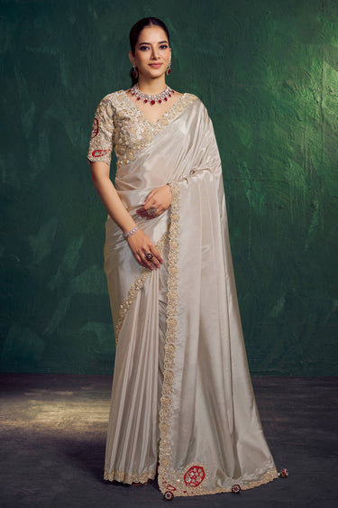 Add charm to your wedding wardrobe with this beautifully designed readymade designer saree. The graceful embroidered border work gives it a rich and stylish appearance, ideal for wedding functions and festive gatherings. Note: Due to digital photography and screen resolution, slight color variations may occur.