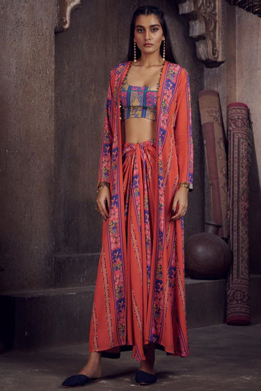 Exclusive Red Color Viscose Crepe Fabric Designer Readymade Drape Skirt With Jacket