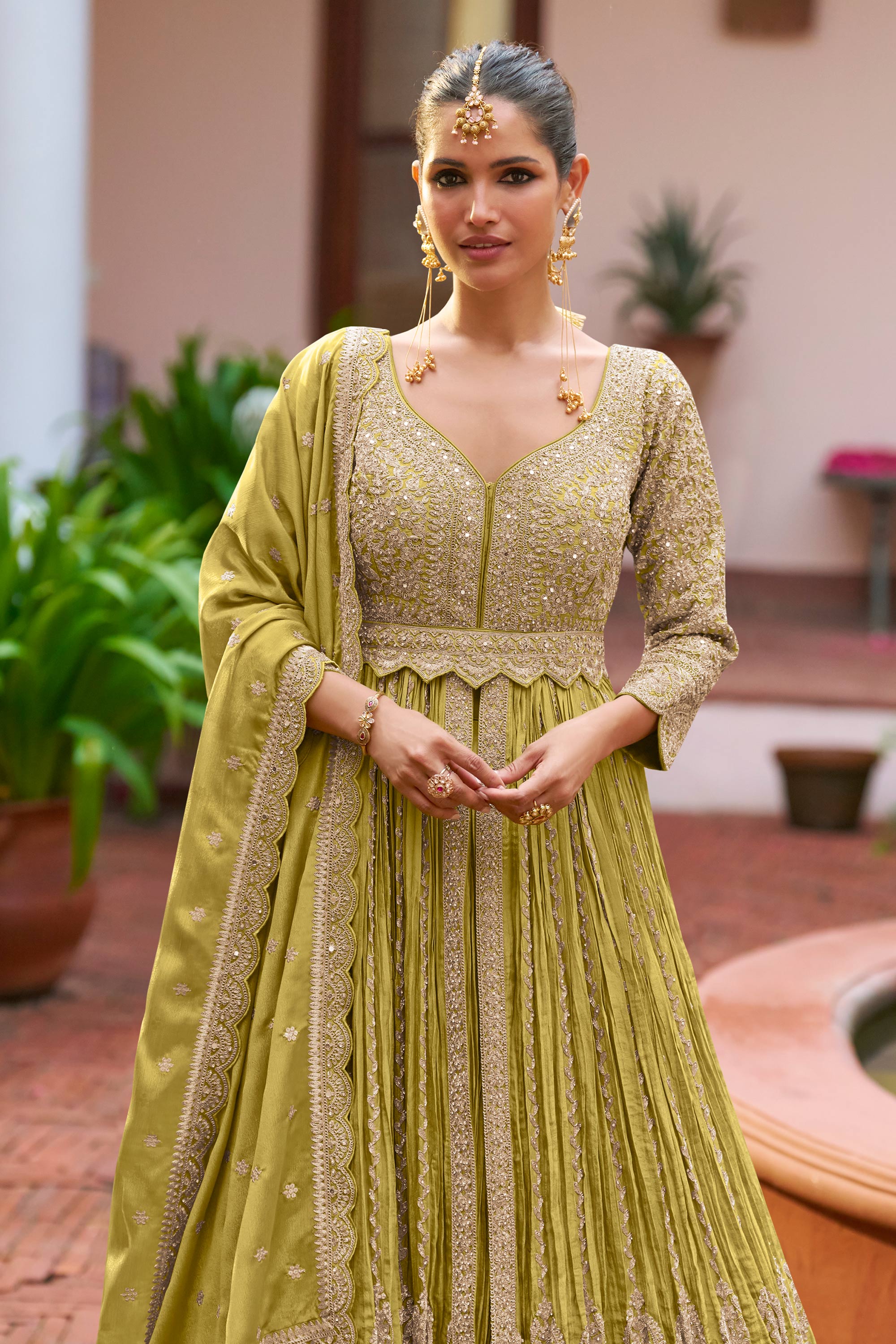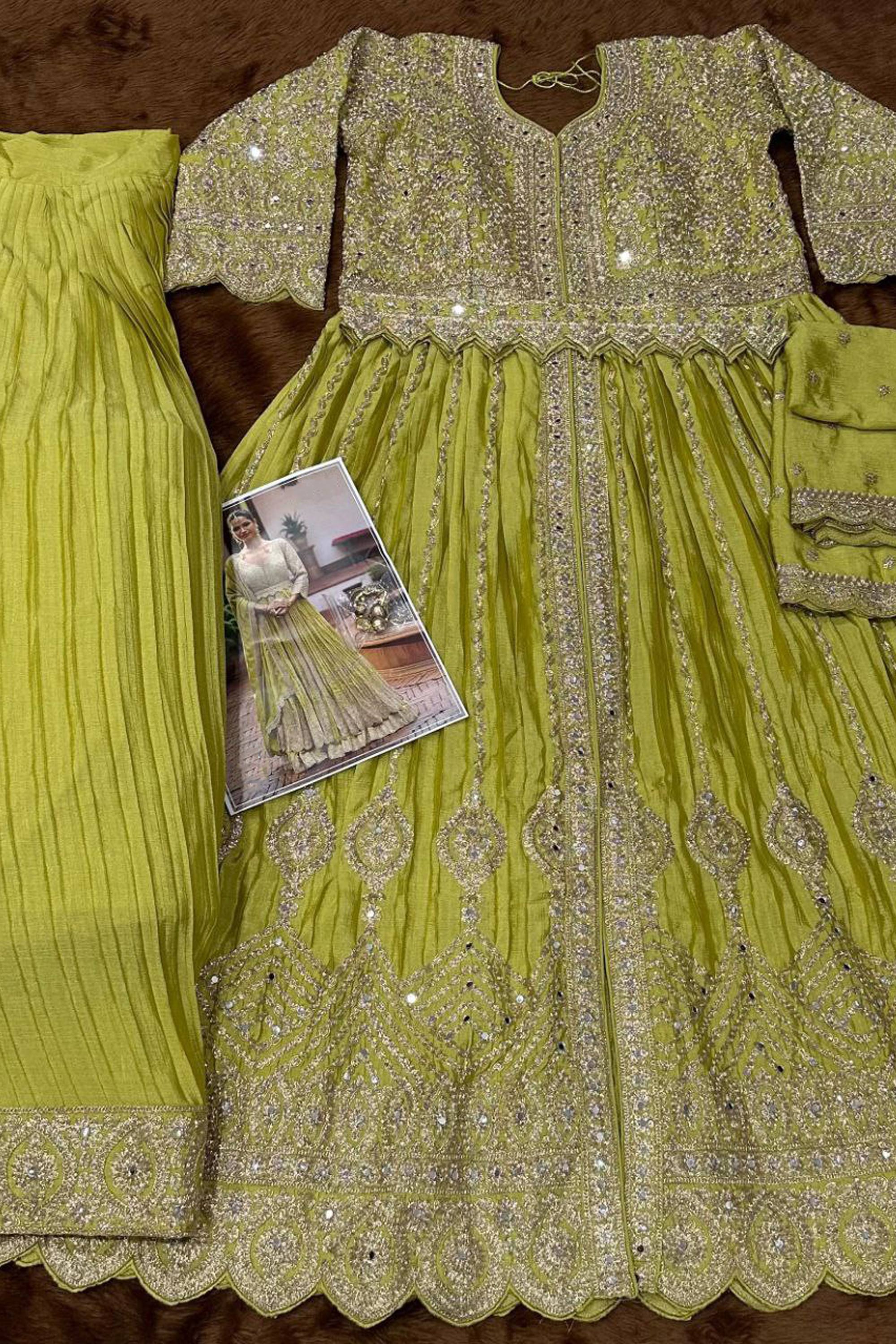 Step into elegance with this beautifully crafted readymade designer lehenga made from luxurious Chinon fabric. The embroidered top adds a festive and stylish touch, while the matching Chinon lehenga offers a graceful and flowy silhouette. Paired with a coordinated Chinon dupatta, this outfit is perfect for parties and special occasions. Its rich color tone enhances the overall charm. Note: Due to digital photography, slight color variations may occur.