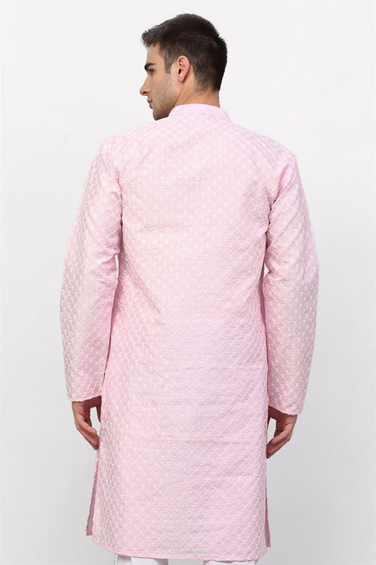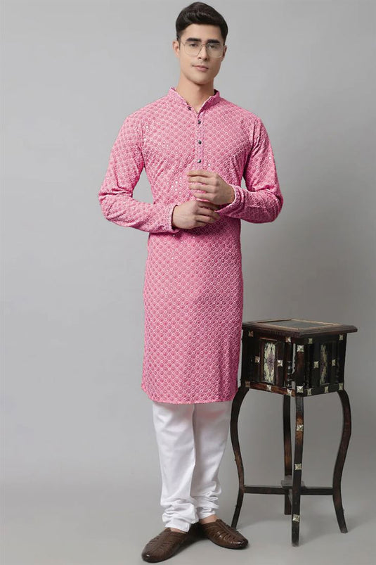 $55.63 USD$111.25 USD Original Price Save 50%/ Pink Festive Wear Art Silk Fabric Embroidered Kurta Pyjama For MenSave 50%
