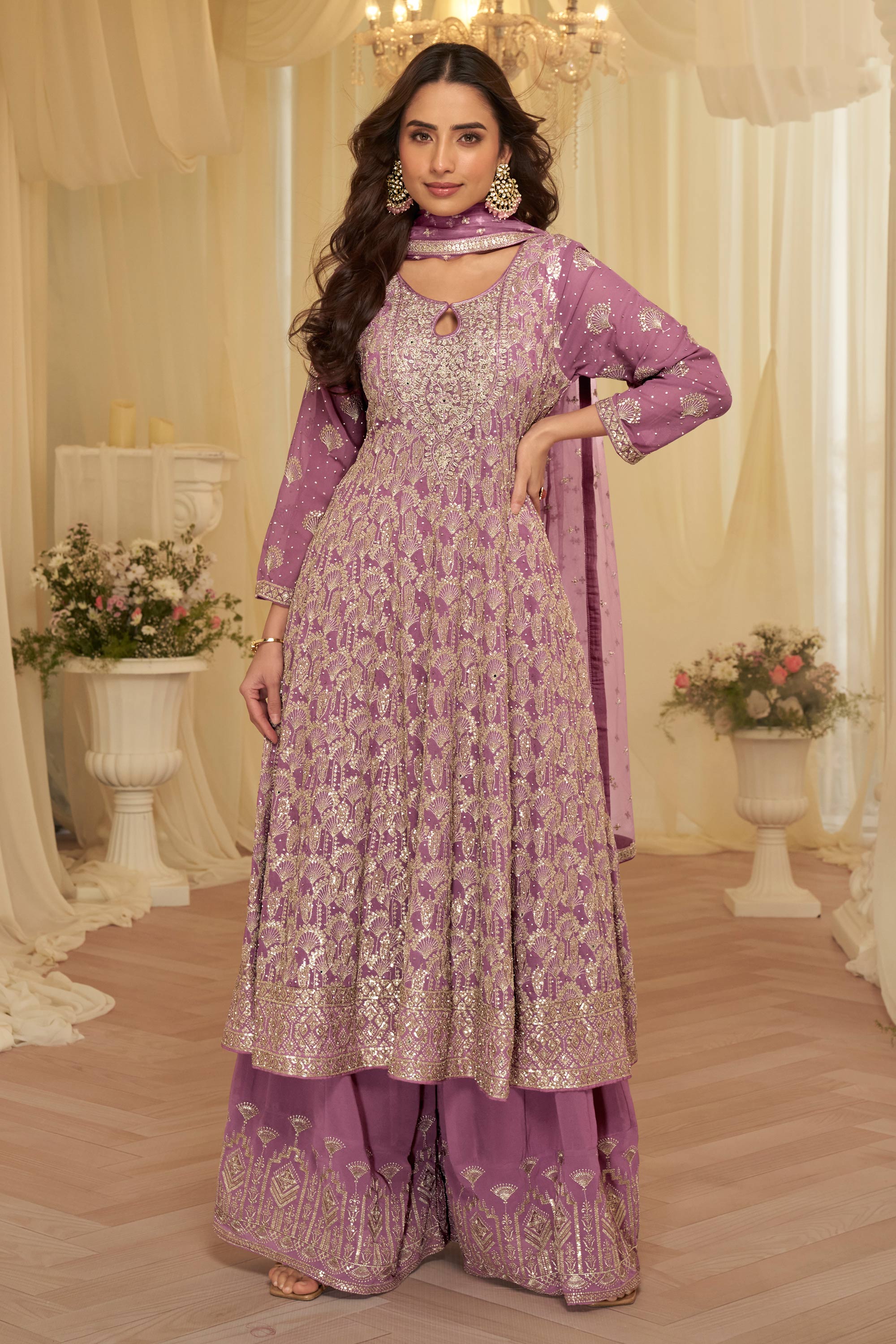 Celebrate special moments in elegance with this beautiful Salwar Kameez Palazzo Suit crafted from soft Georgette fabric. The coordinated top, bottom, and dupatta offer a flowy silhouette and comfortable wear. Detailed with graceful embroidery work, this readymade outfit comes in a rich color, making it perfect for sangeet functions and special occasions. Note: Due to digital photography, slight color variations may occur.