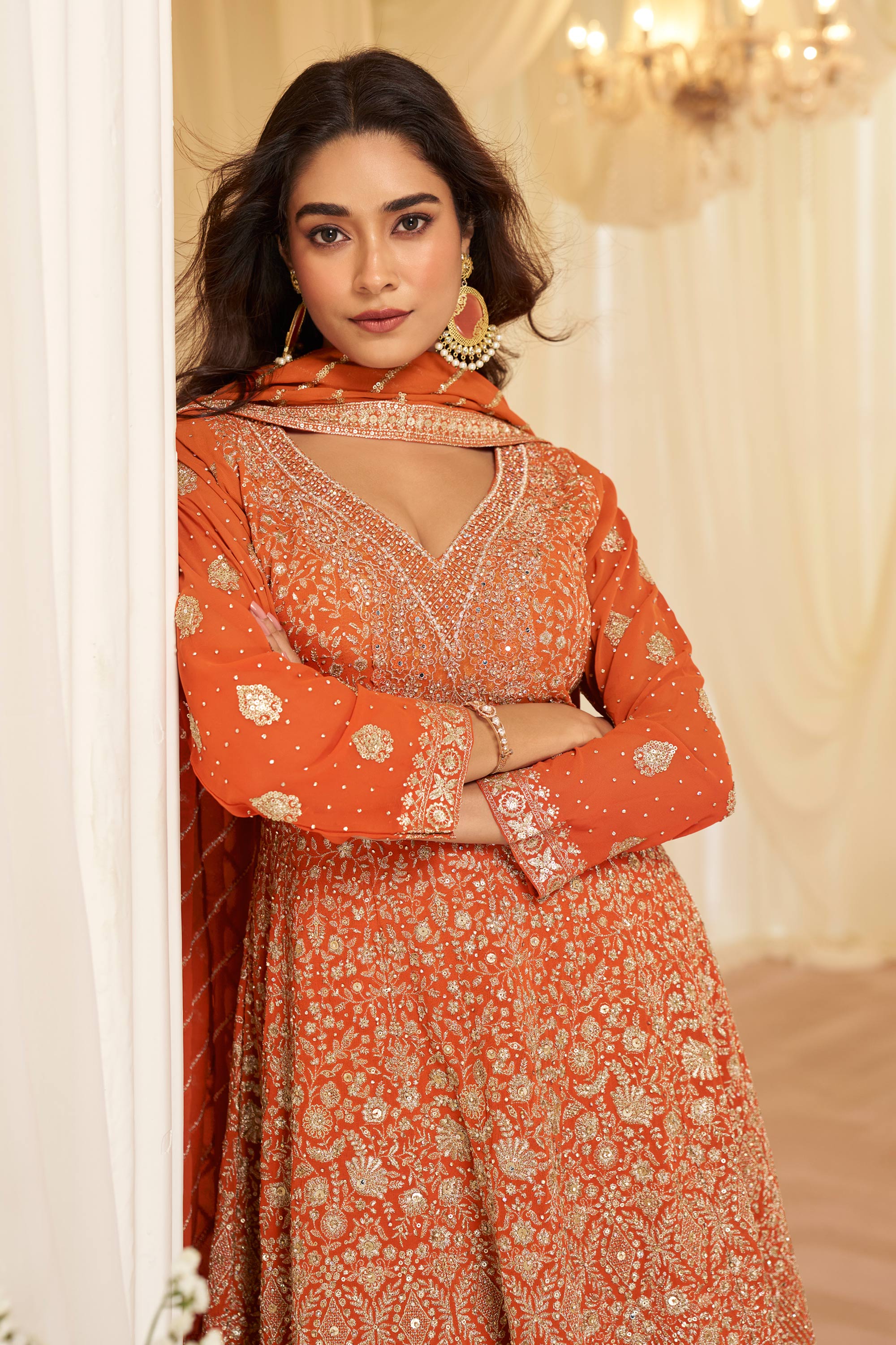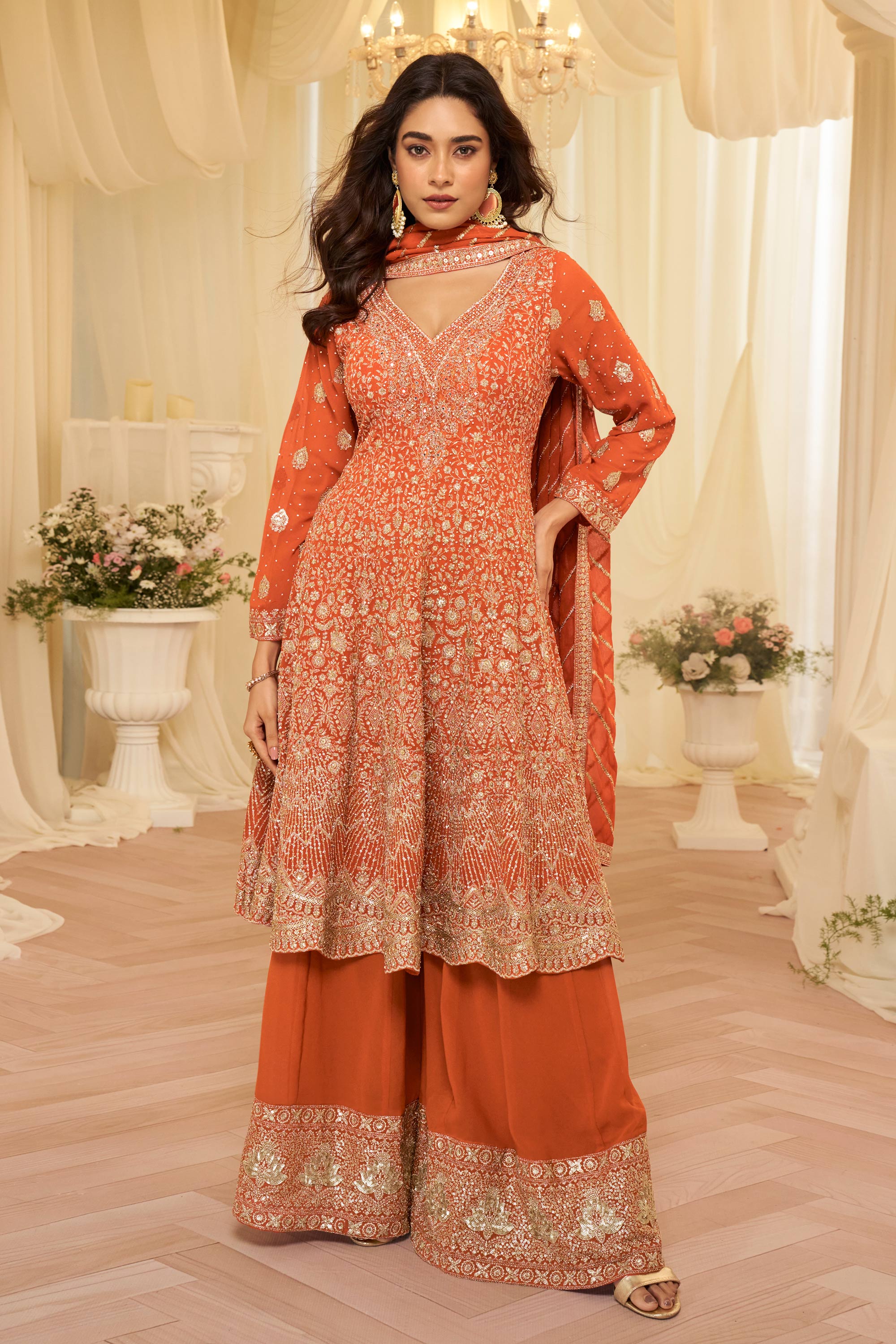 Rust Sangeet Wear Georgette Embroidered Readymade Palazzo Suit
