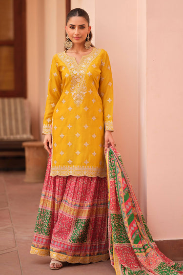Yellow Wedding Wear Chinon Silk Embroidered Readymade Palazzo Suit