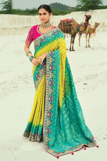 Bridal Style Yellow And Cyan Bandhej Saree With Pure Georgette And Heavy Border Work
