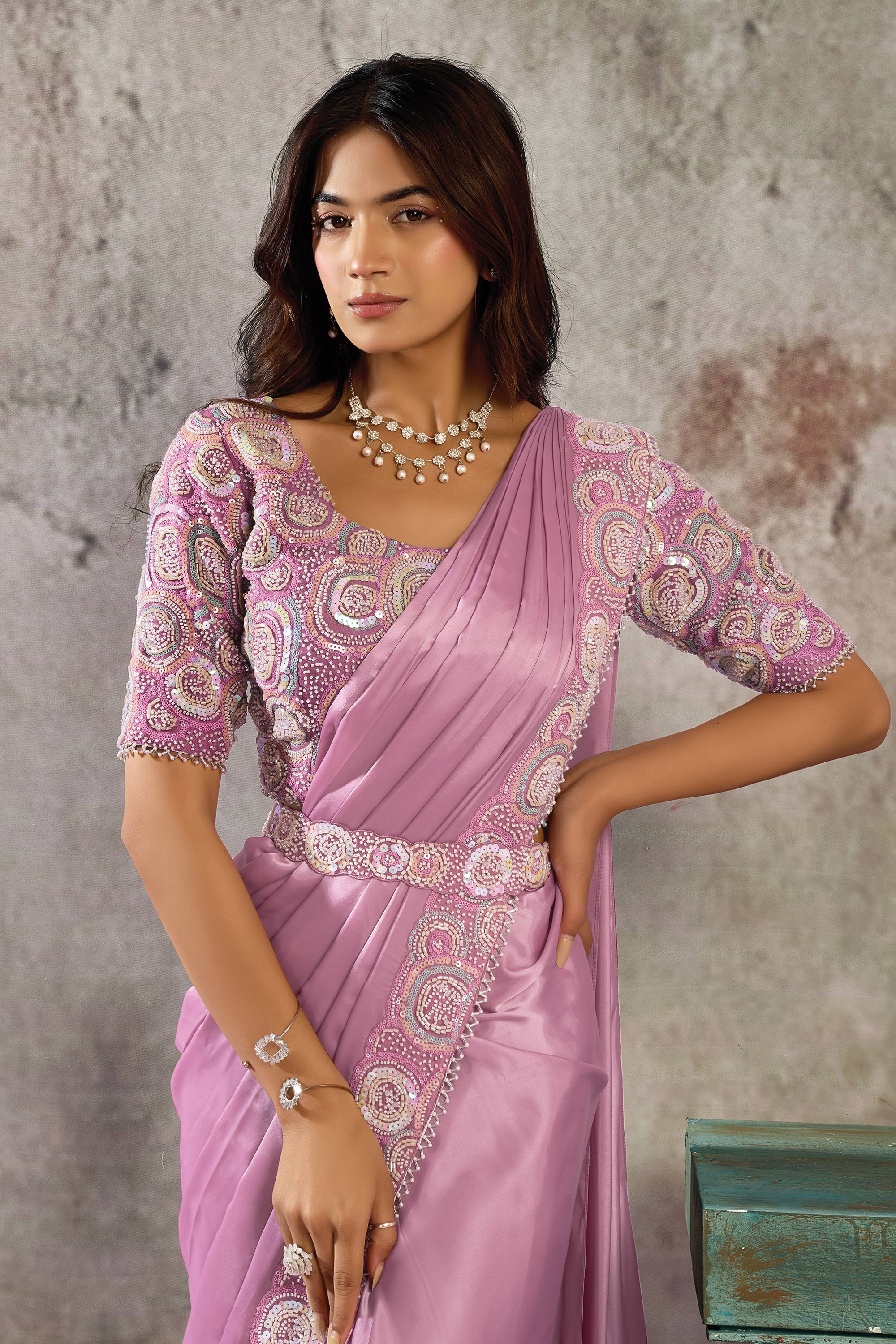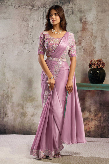 Pink Function Wear Satin Embroidered Border Work Readymade Saree