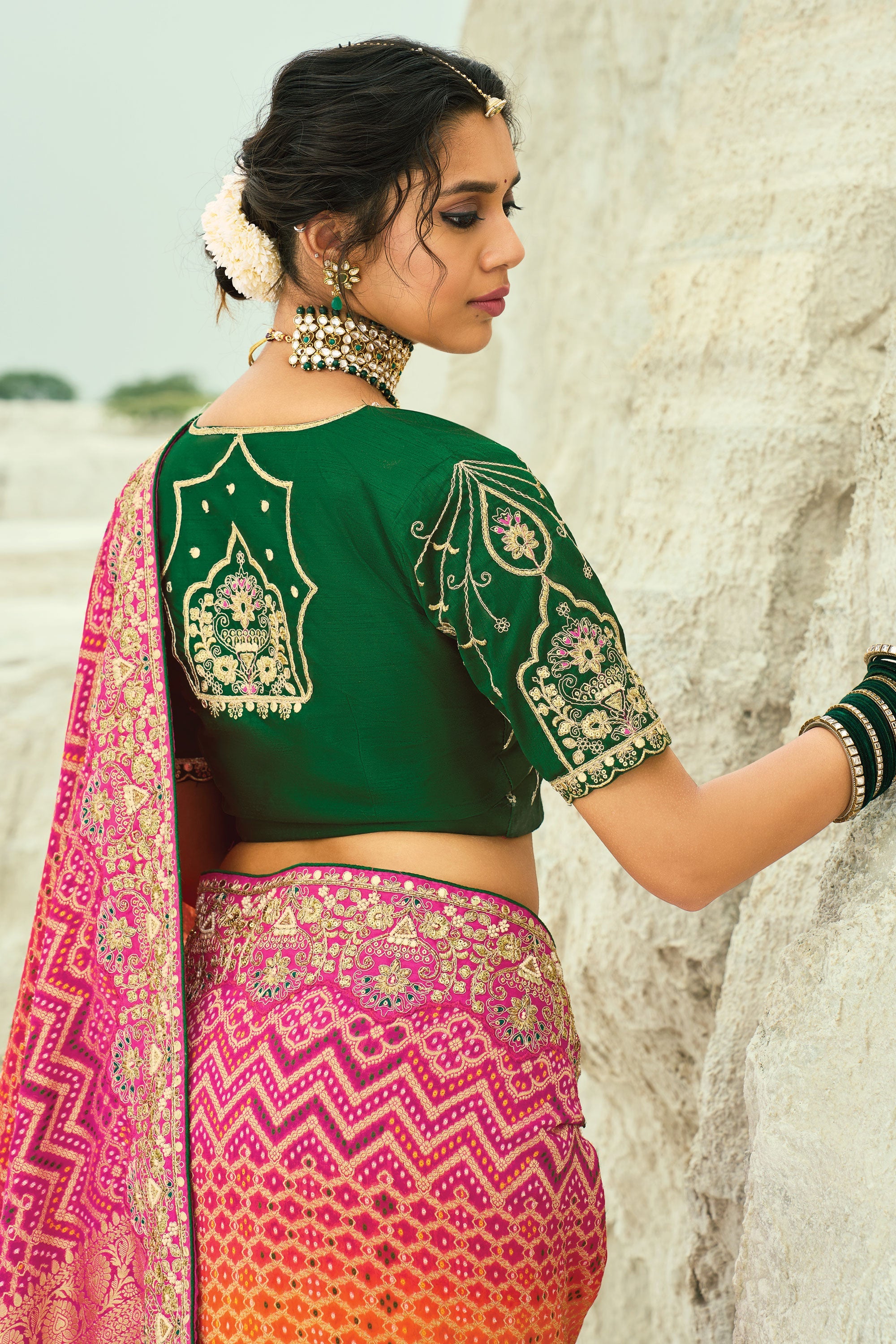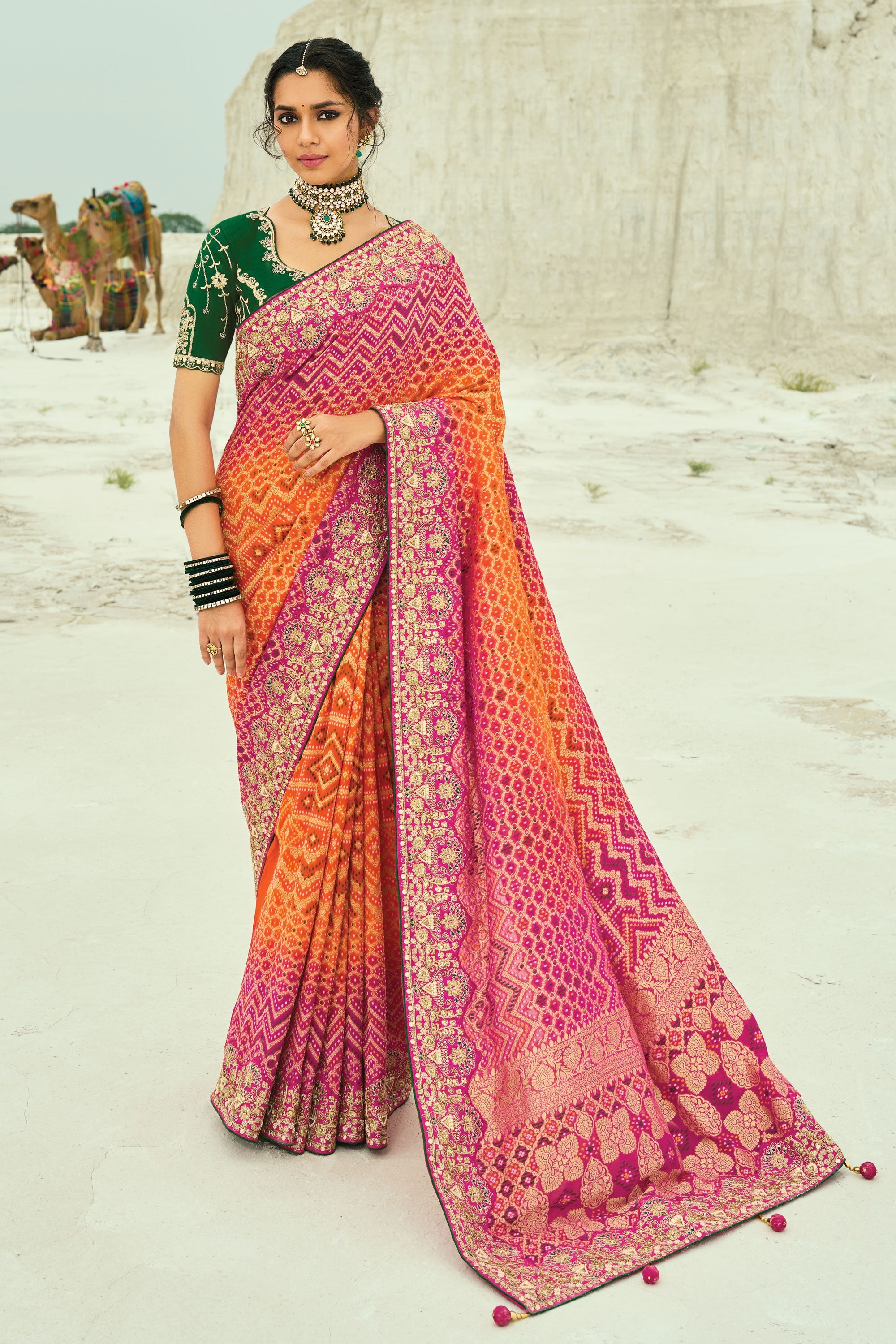 Stylish Orange And Rani Bandhej Saree In Pure Georgette With Cut Dana Hand Border