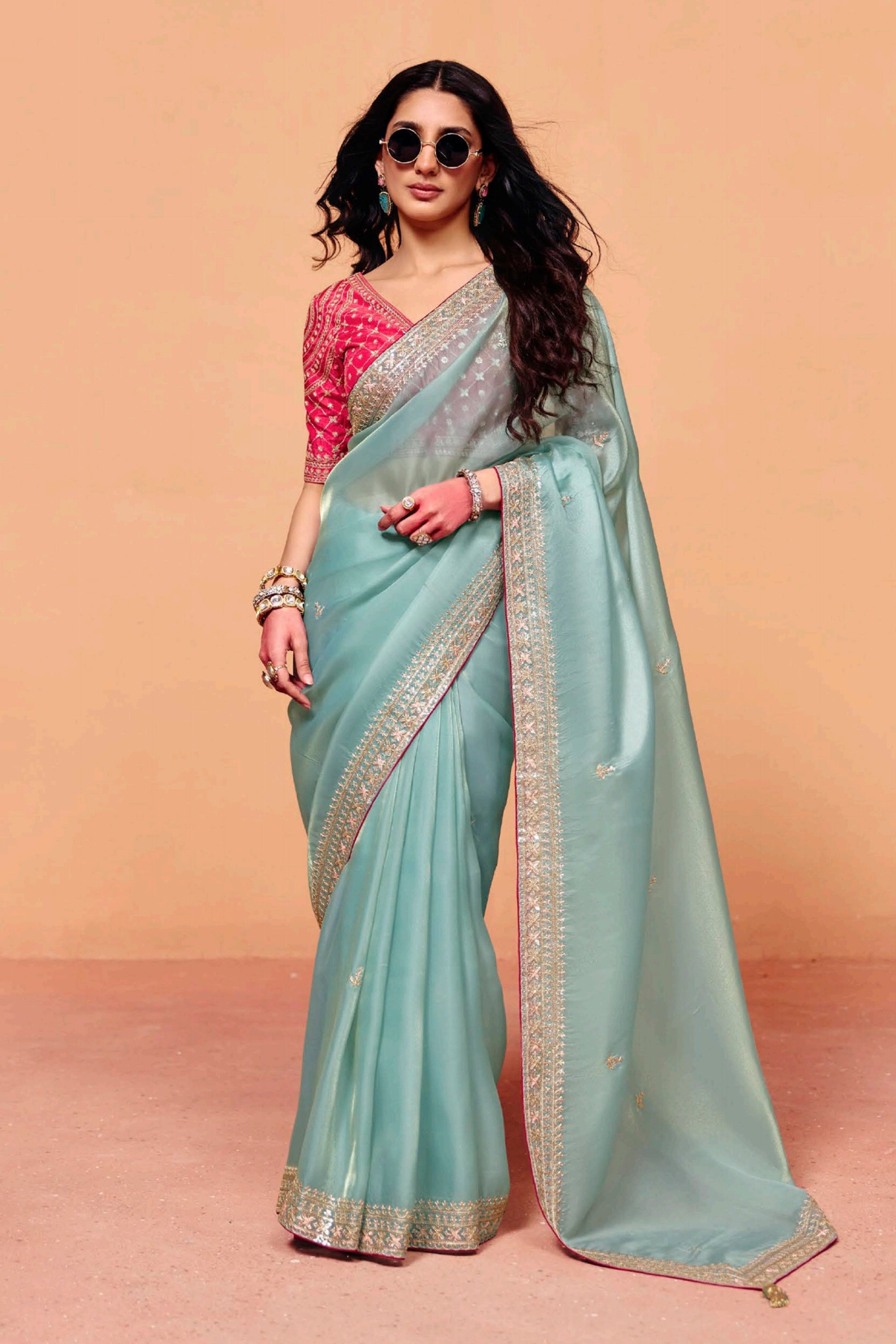 Make a lasting impression at your next celebration with this stunning Tissue Silk Traditional Saree. Designed for Sangeet and other special events, it showcases a detailed embroidered border that adds timeless sophistication to your look. The high-quality tissue silk fabric offers a perfect balance of comfort and elegance, making it suitable for day-to-night festivities. The unstitched blouse gives you the opportunity to create a customized fit that matches your individual style. Perfect for weddings and festivals, this saree captures the beauty of heritage fashion with a touch of contemporary finesse. Add this statement piece to your wardrobe today.