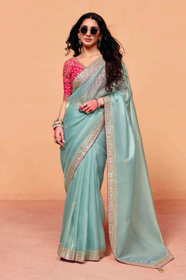 Tissue Silk Traditional Light Cyan Embroidered Border Work Festive Wear Saree With Unstitched Blouse