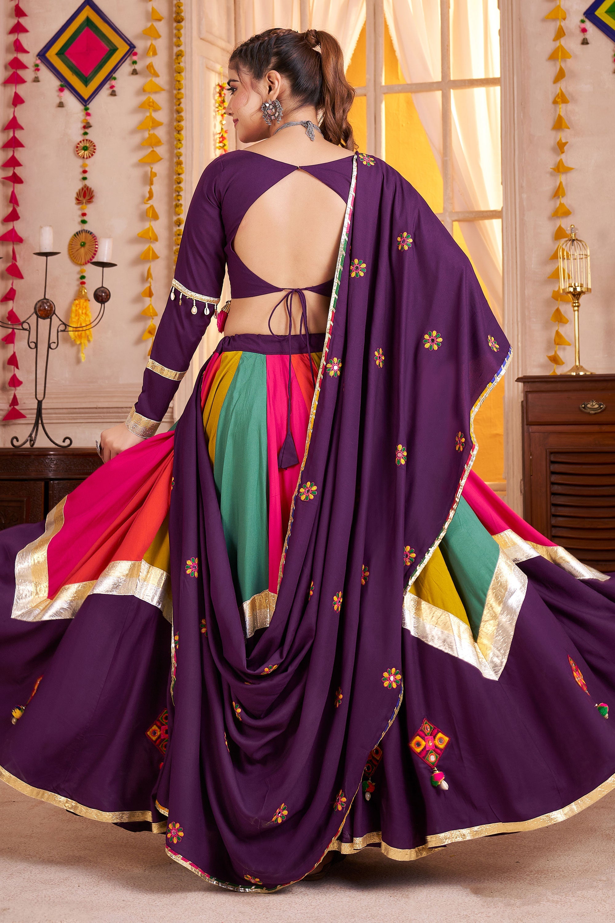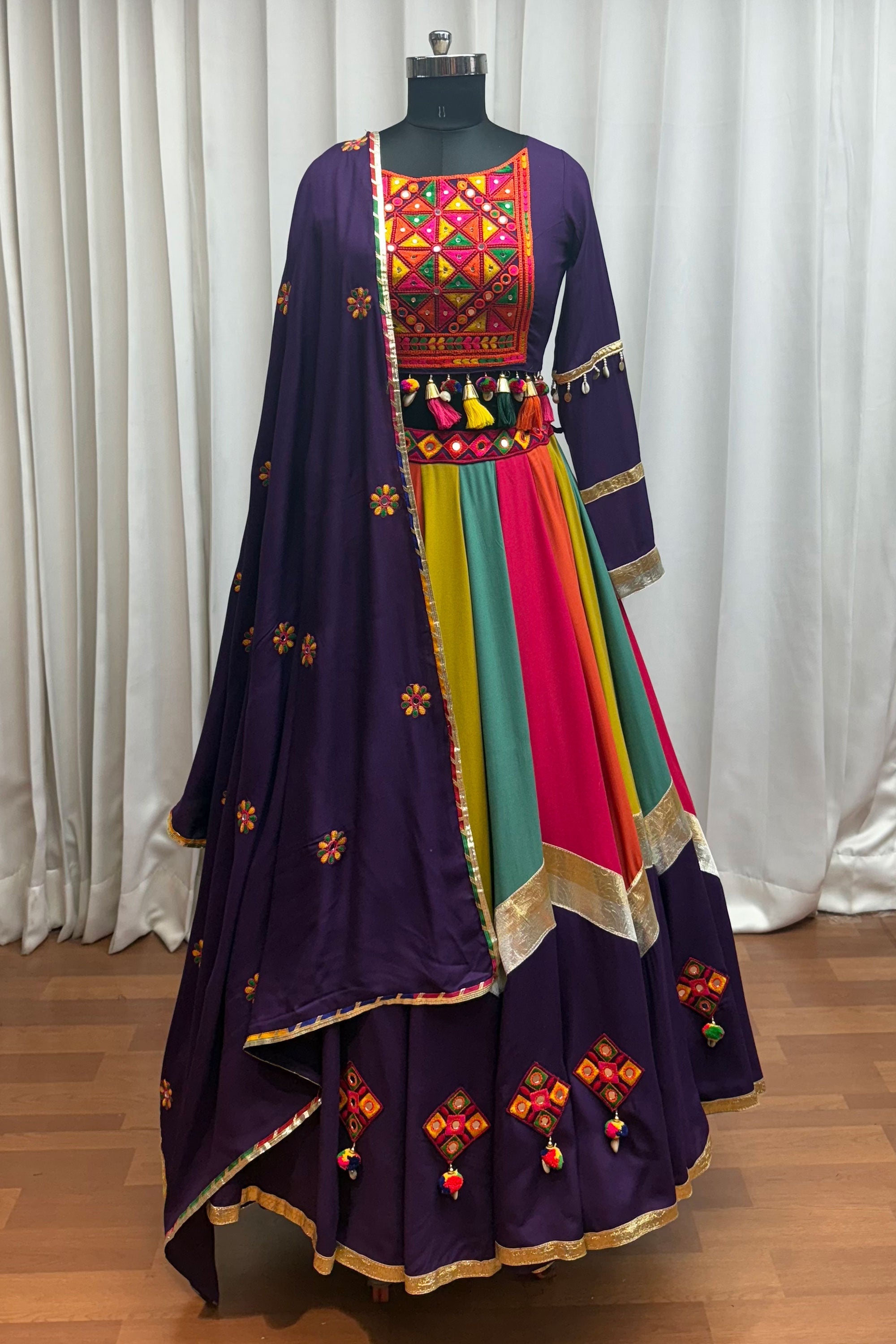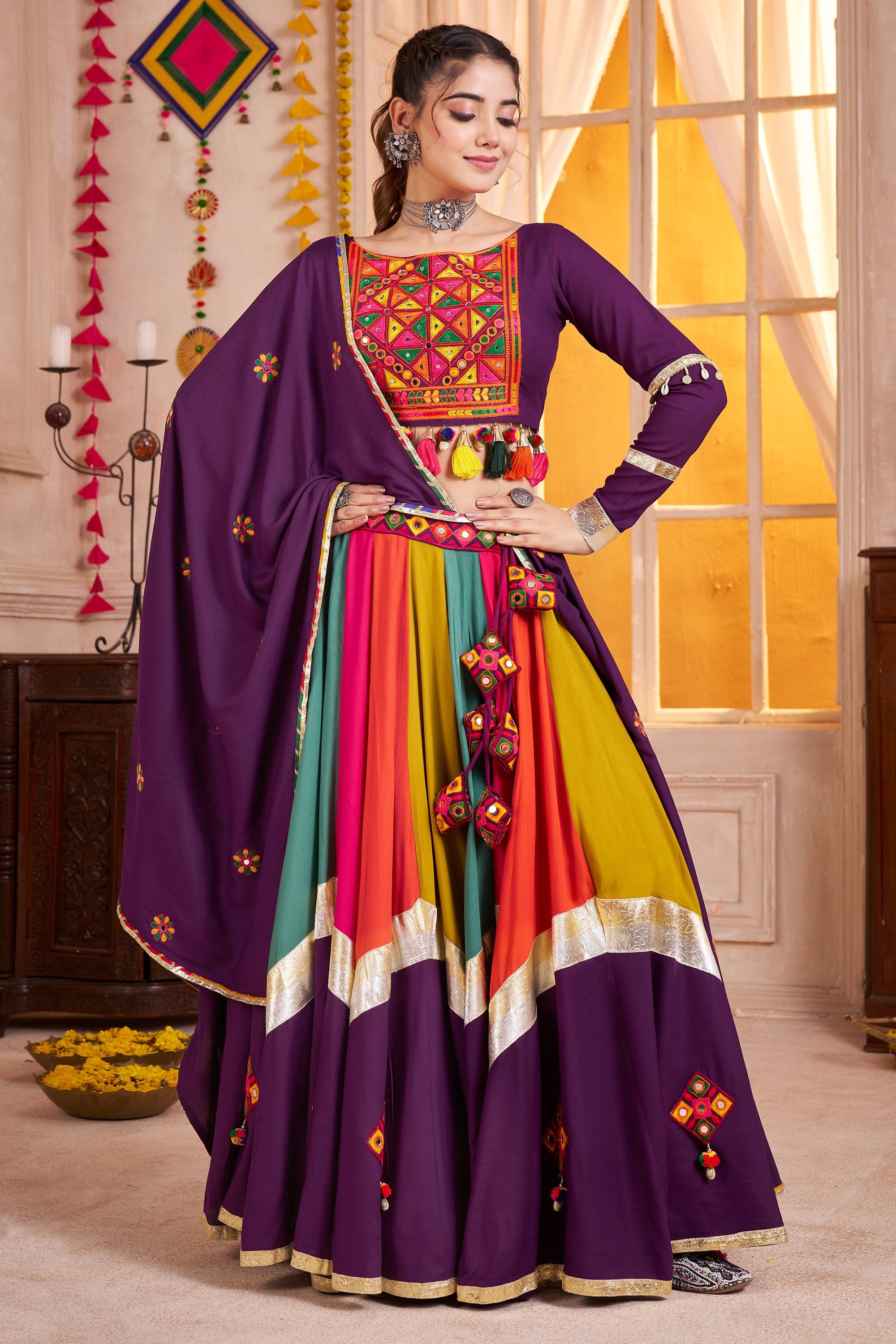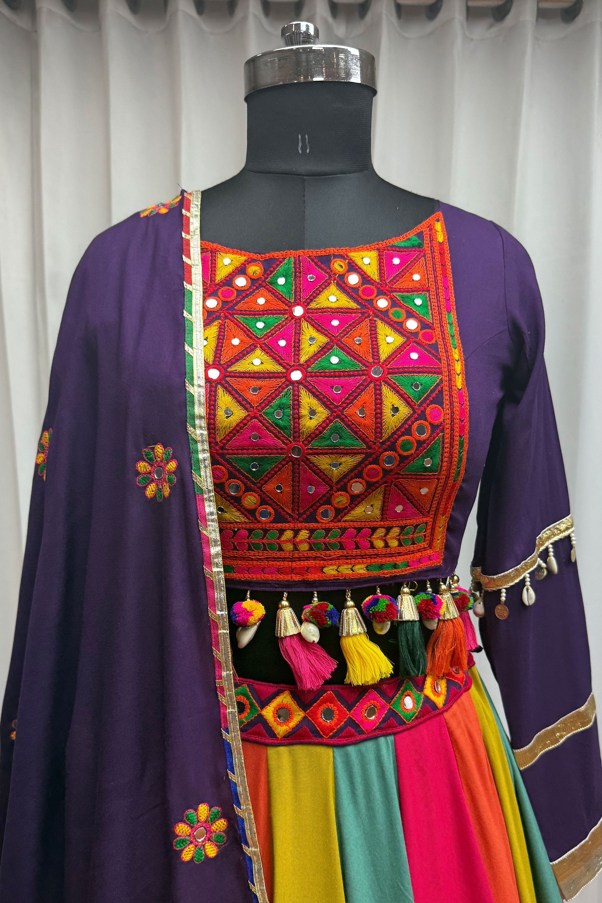 Purple Viscose Cotton Embroidered Mirror Work Readymade Lehenga For Navratri Celebrations