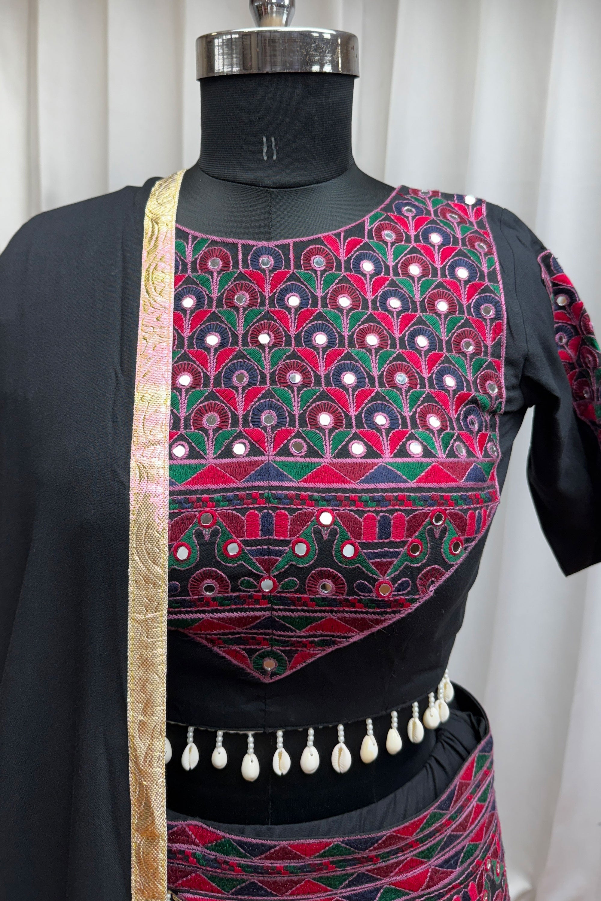 Step into the spirit of Navratri with this vibrant viscose cotton lehenga, a perfect blend of comfort and timeless style. The rich mirror work embroidery creates a dazzling display of artistry while keeping the design graceful and authentic. The soft, high-quality viscose cotton fabric offers exceptional ease of movement, perfect for dancing and social events during festive occasions. Featuring a comfortable fit and carefully finished seams, this lehenga is designed to last through seasons of celebrations. Ideal for pairing with bold jewelry and traditional accessories, this attire is a wardrobe must-have for festive enthusiasts.