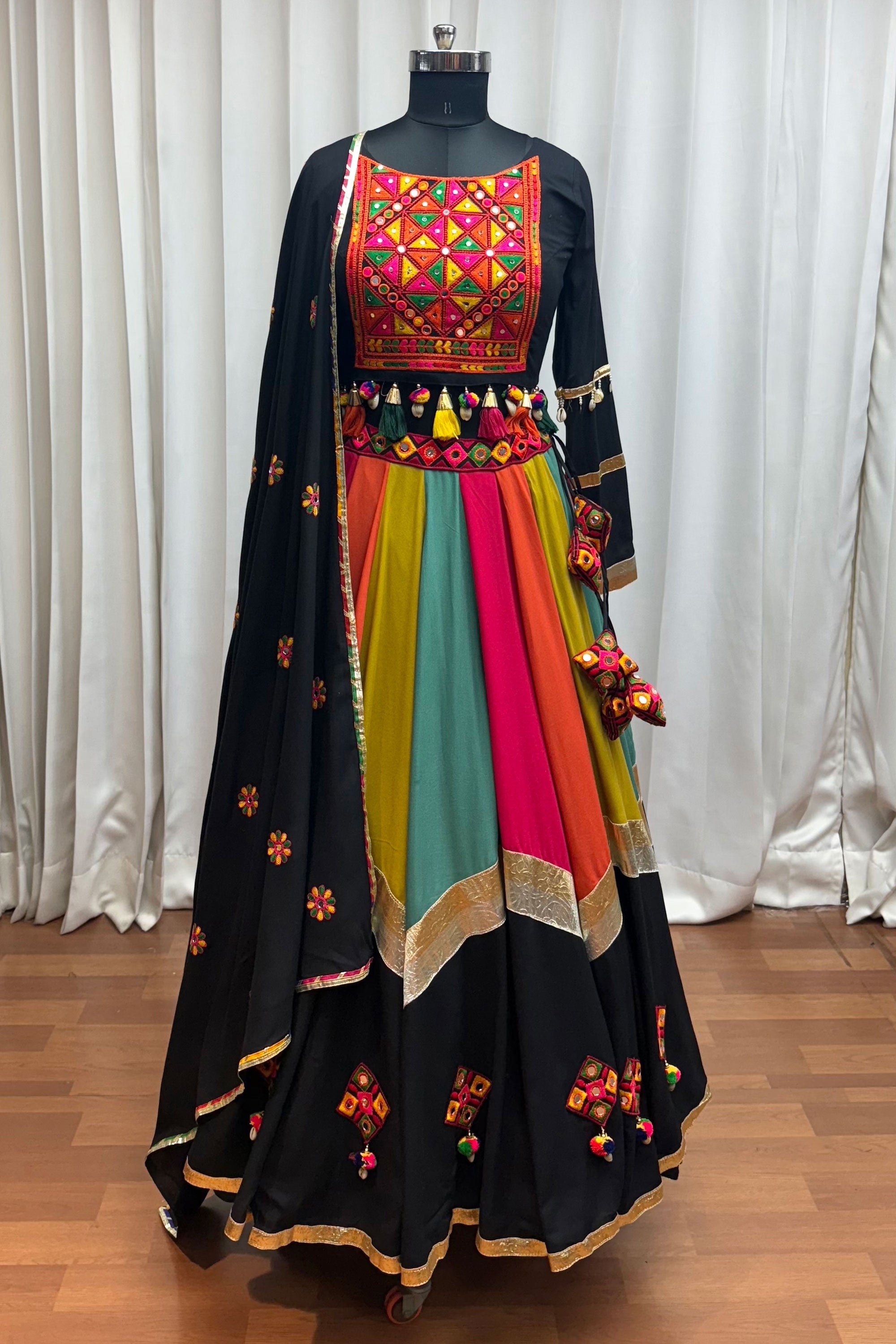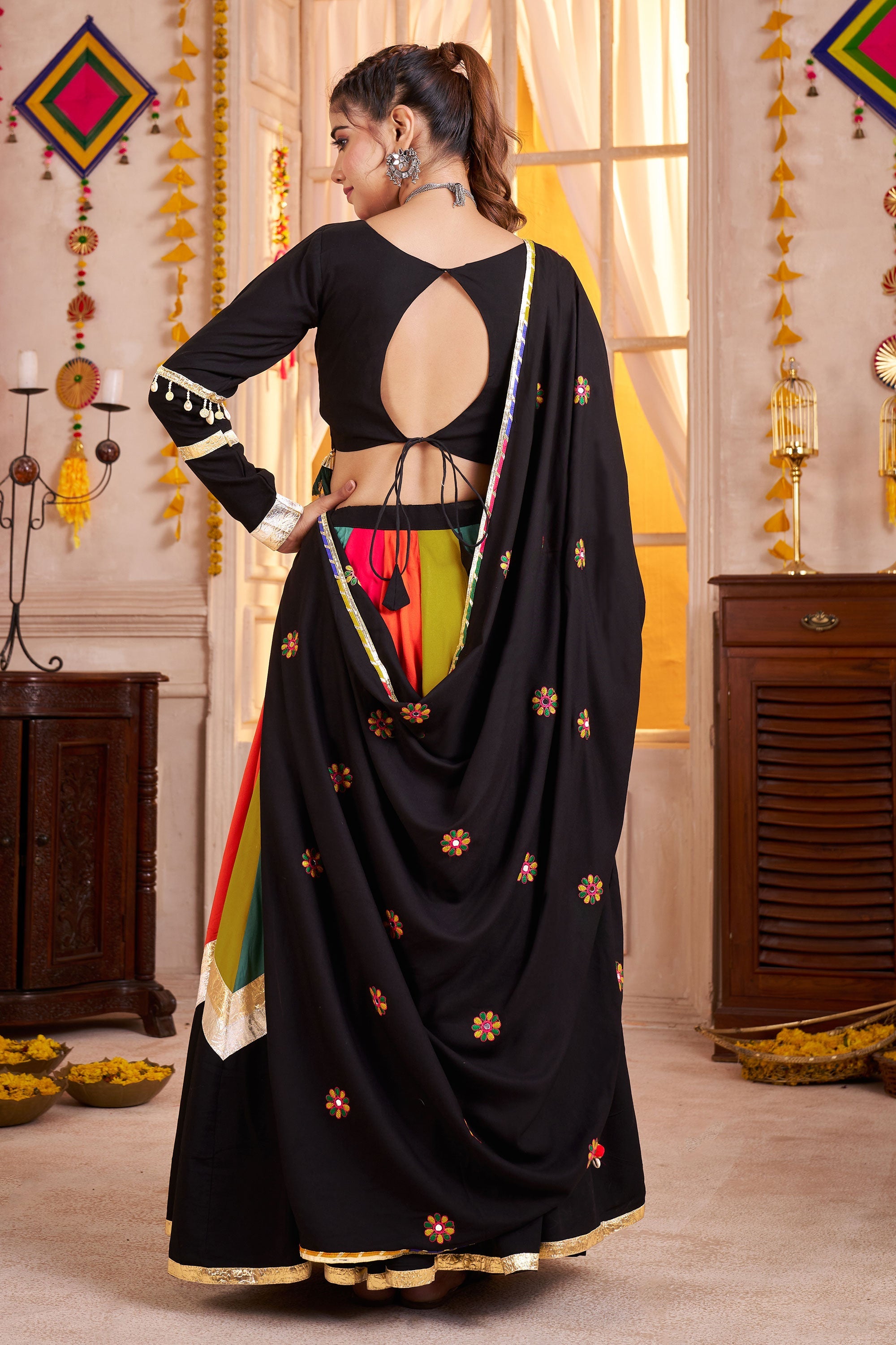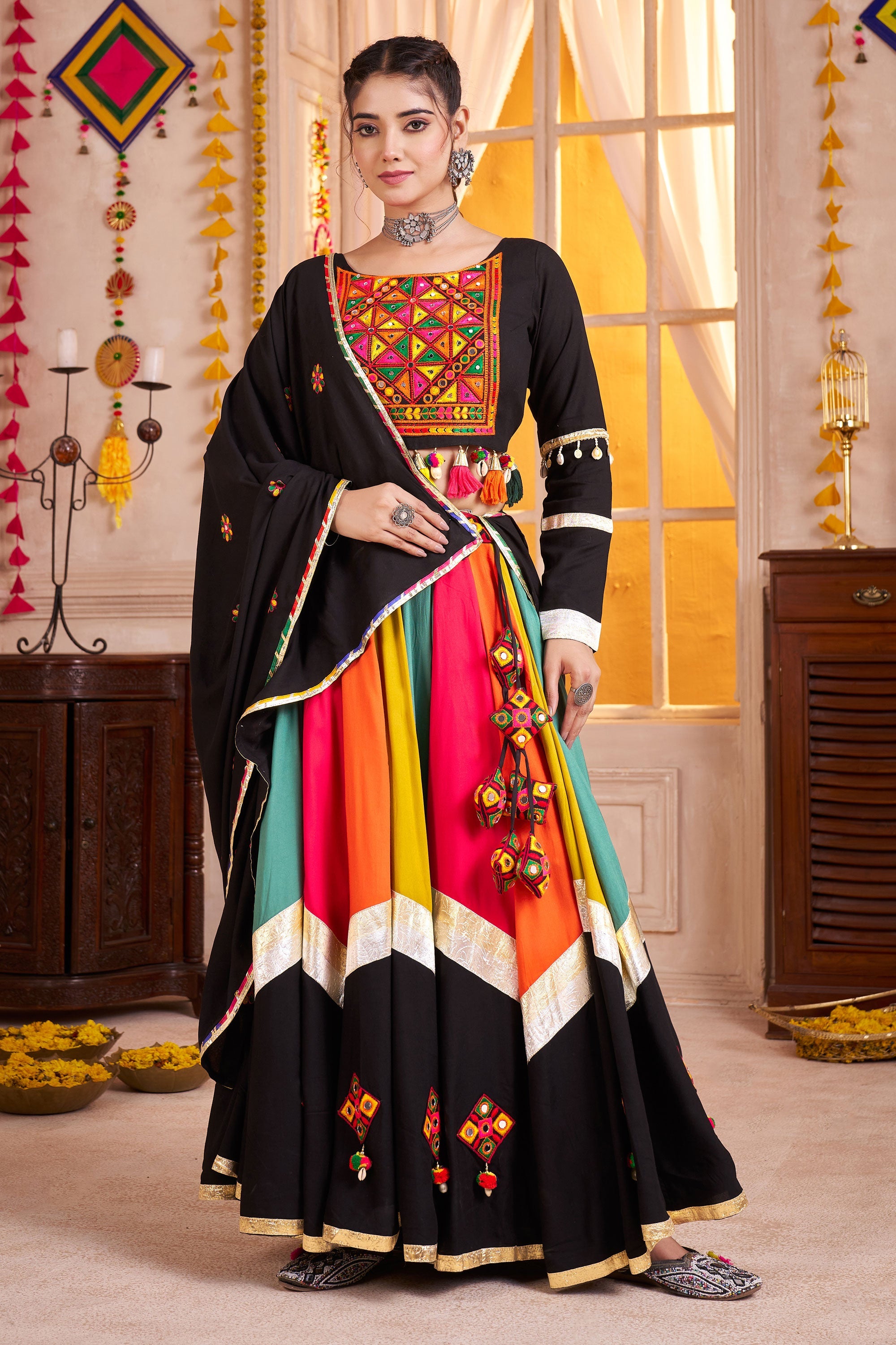 Celebrate Navratri in this exquisite viscose cotton lehenga adorned with elegant mirror work embroidery. This readymade piece is thoughtfully designed for comfort, ensuring you can enjoy your festivities without compromise. The intricate mirror details on the lightweight fabric make this outfit a showstopper for your traditional dance and cultural events. Perfect for all age groups, the versatile design suits every Navratri occasion, adding a touch of authenticity to your wardrobe. Combine it with your favorite accessories for a personalized look. This lehenga will enhance your festive style with ease and grace, creating lasting memories during the celebration.