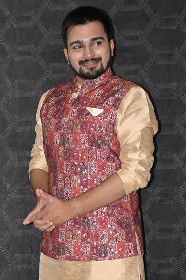 Men Ethnic Cotton Readymade Maroon Color Jacket