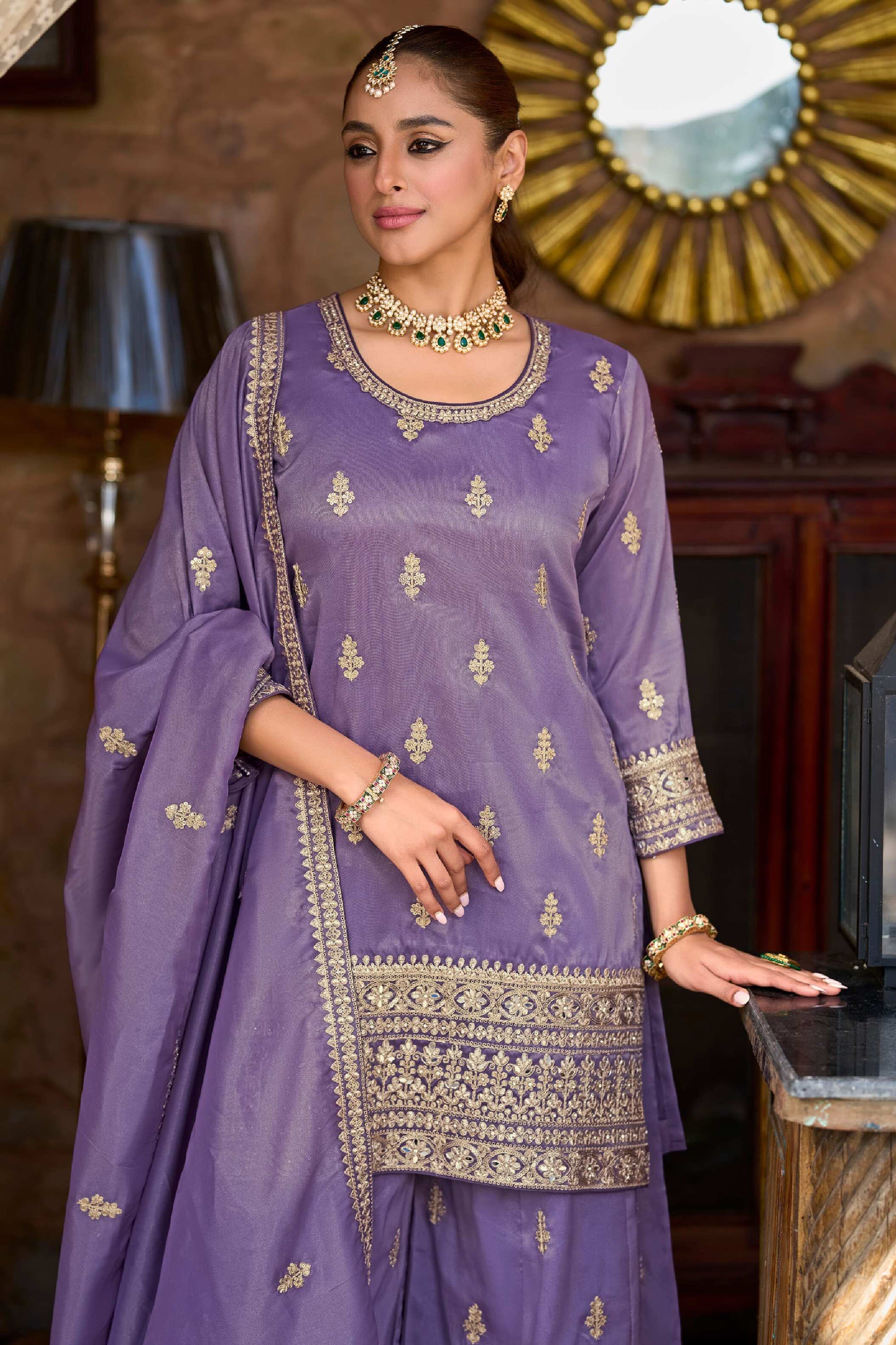 Festive Wear Fancy Fabric Designer Readymade Palazzo Suit In Purple Color