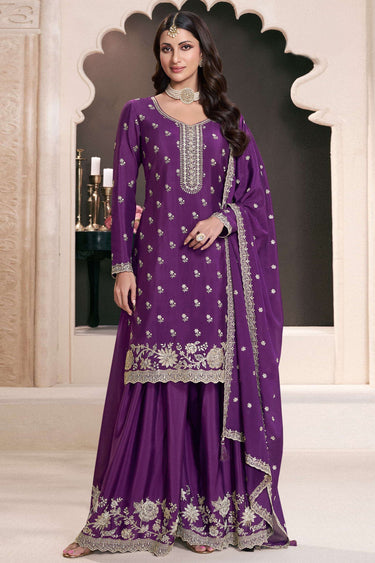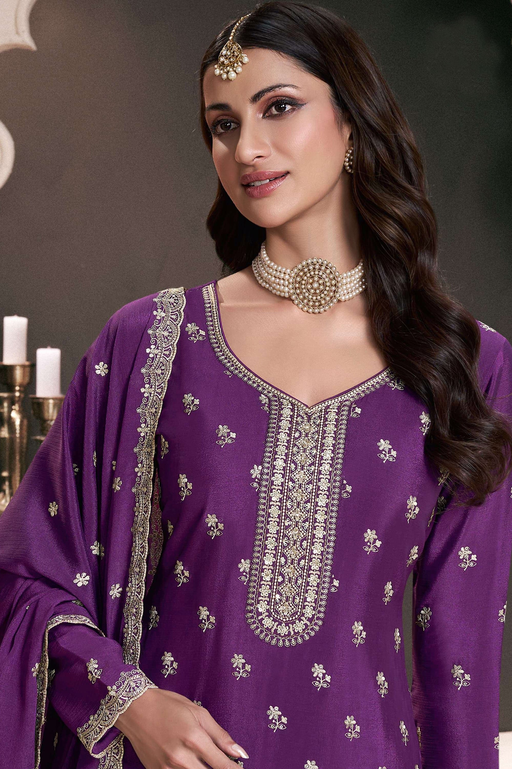 Attractive Purple Chinon Embroidered Readymade Palazzo Suit
