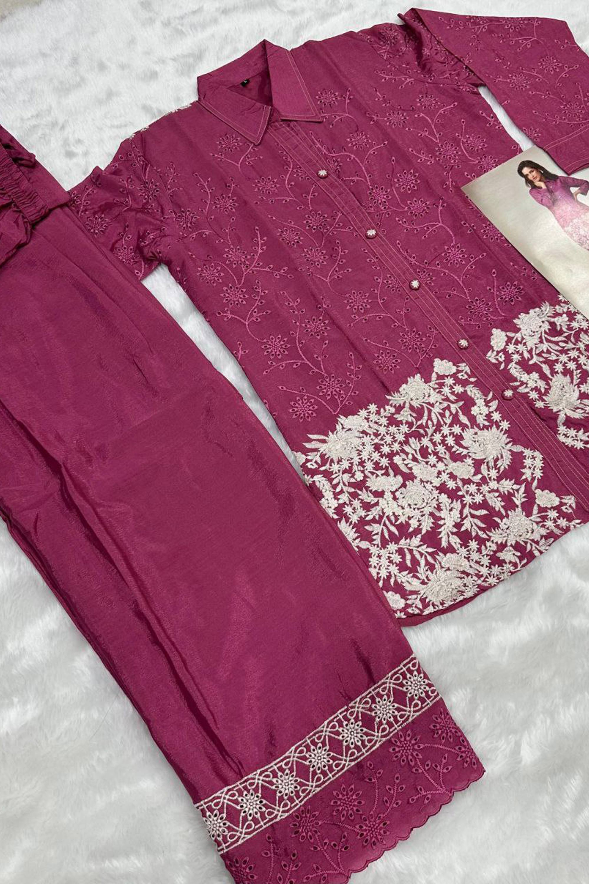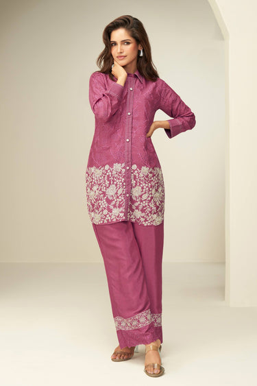 Pink Embroidered Chinon Silk Designer Readymade Co-Ord Set