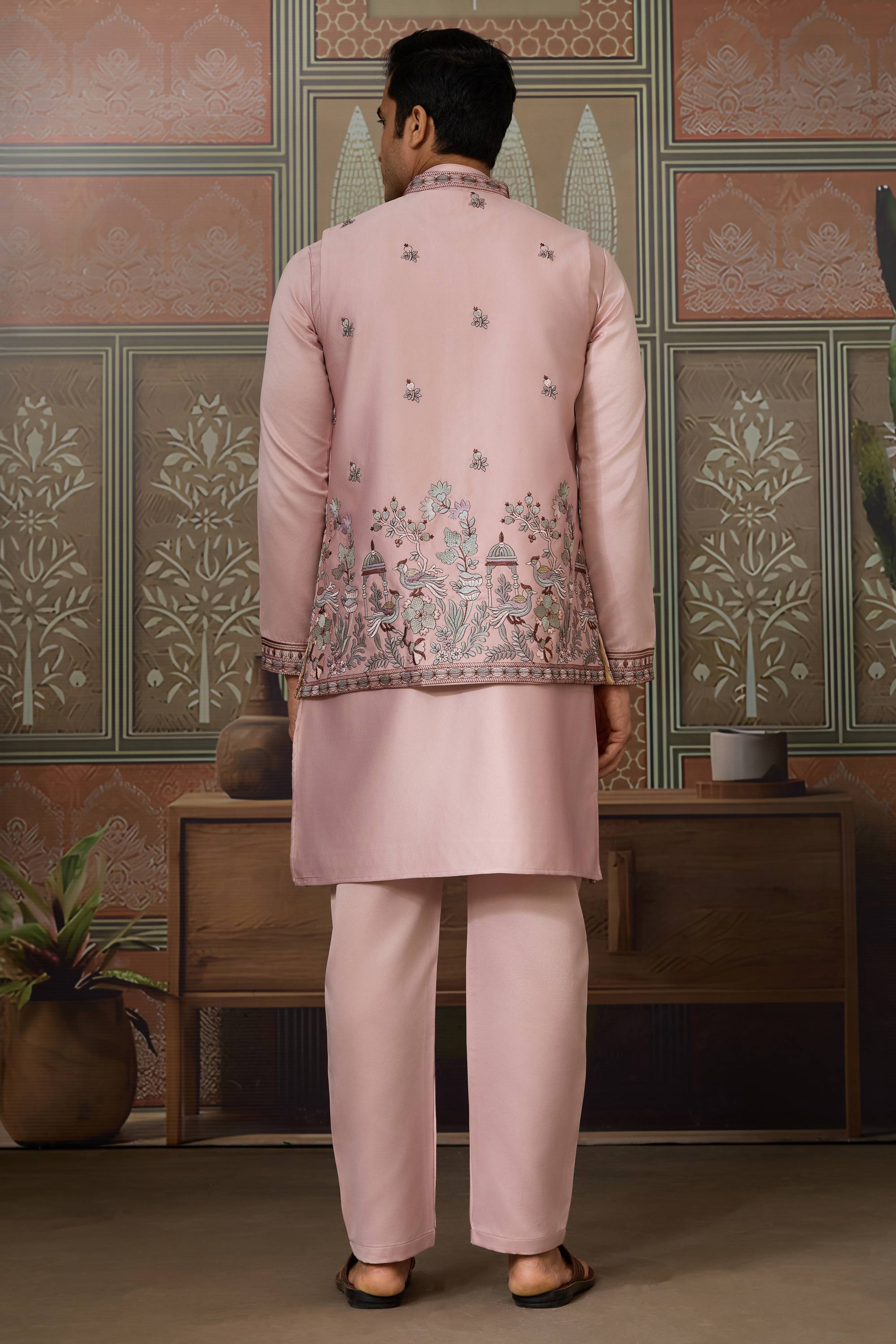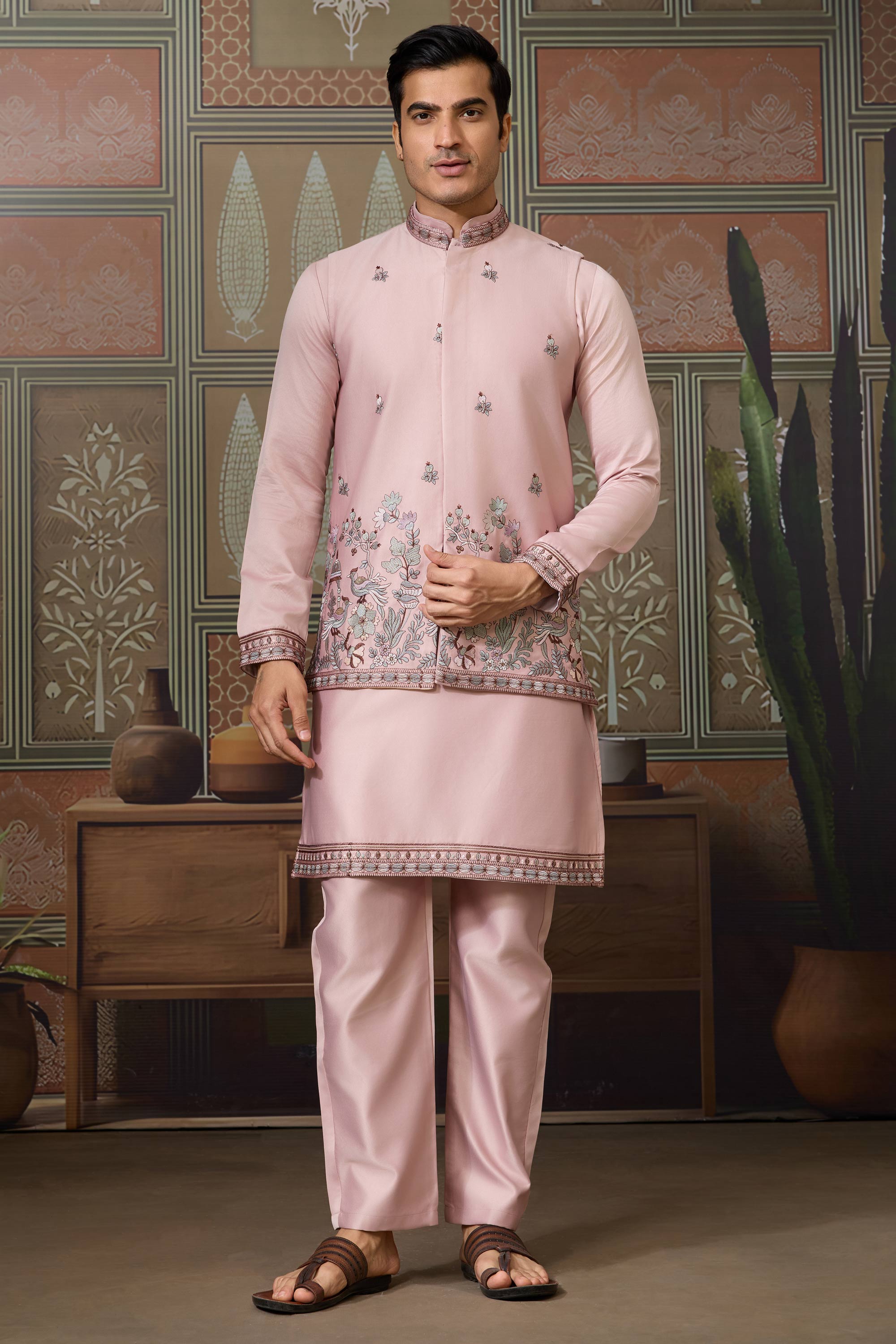 Art Silk Pink Readymade Men Stylish Kurta Pyjama With Jacket set
