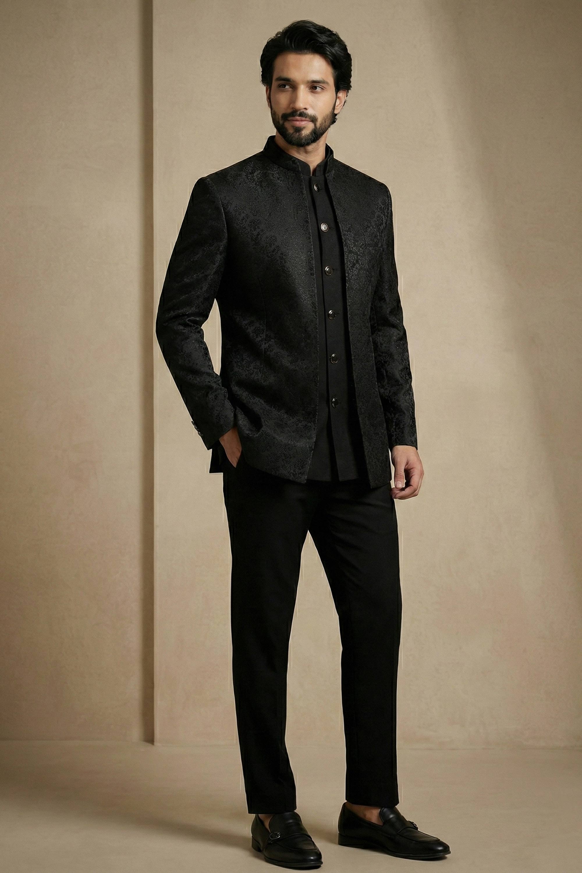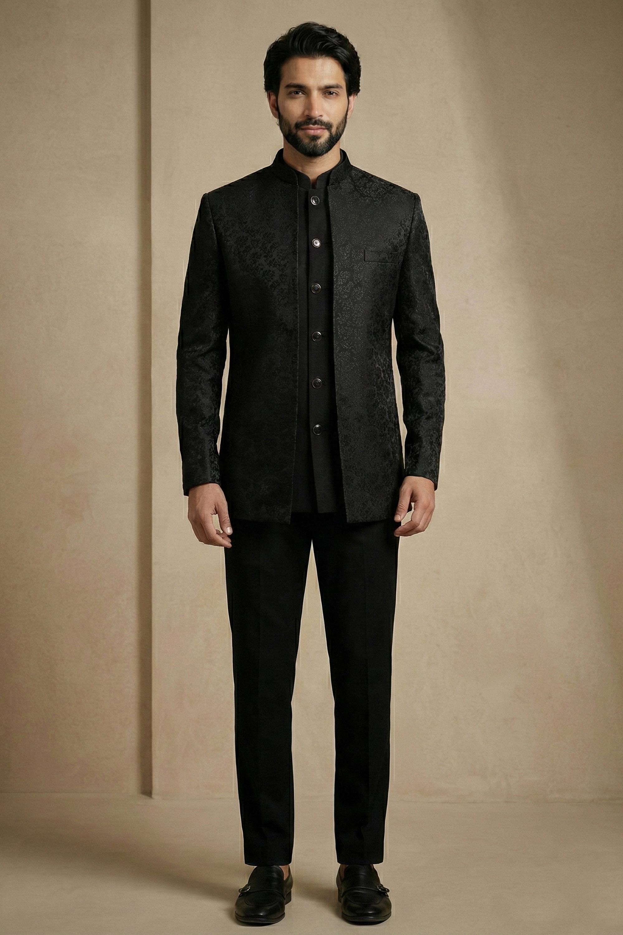 Satin Fabric Black Function Wear Readymade Indo Western For Men