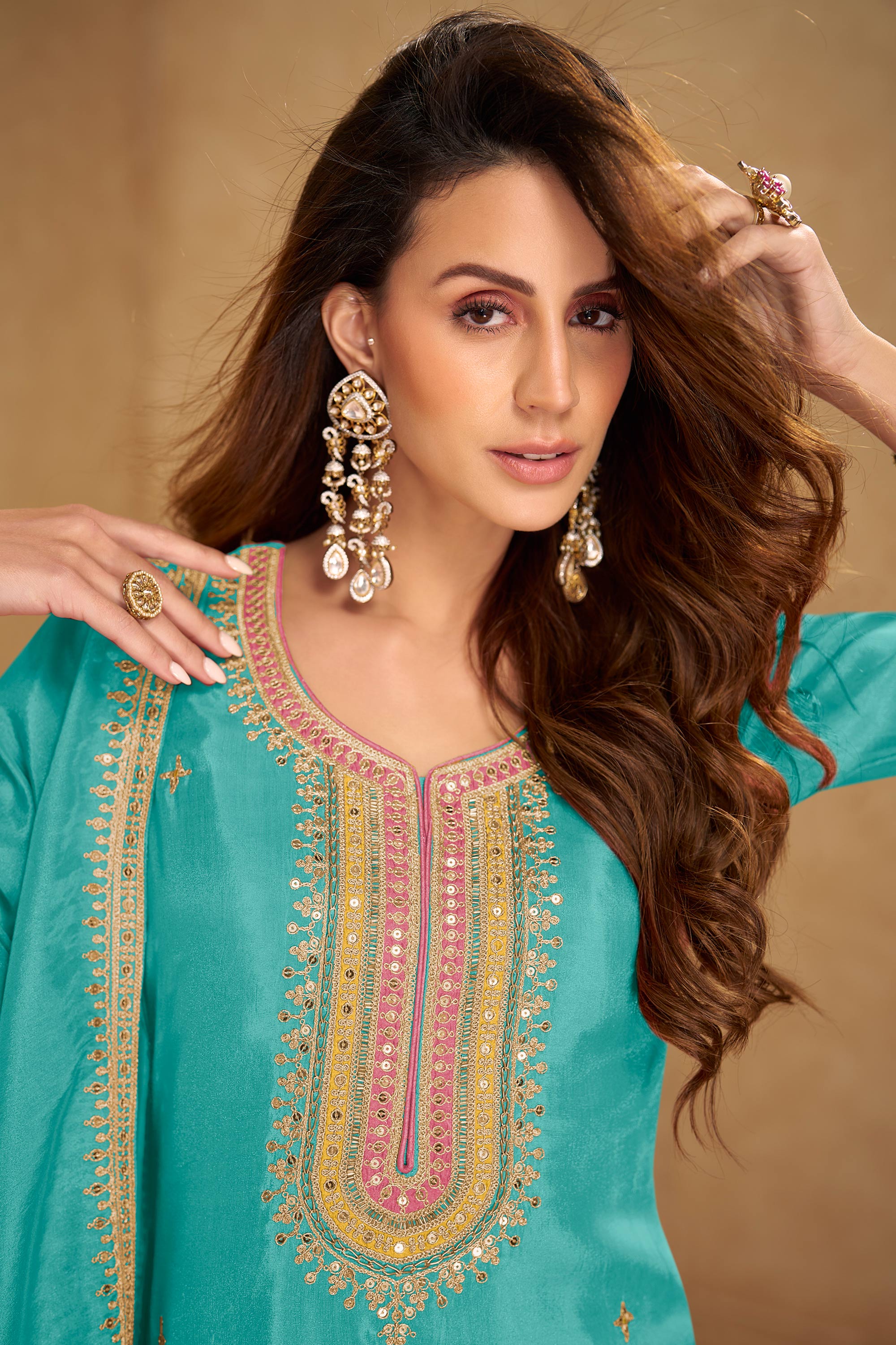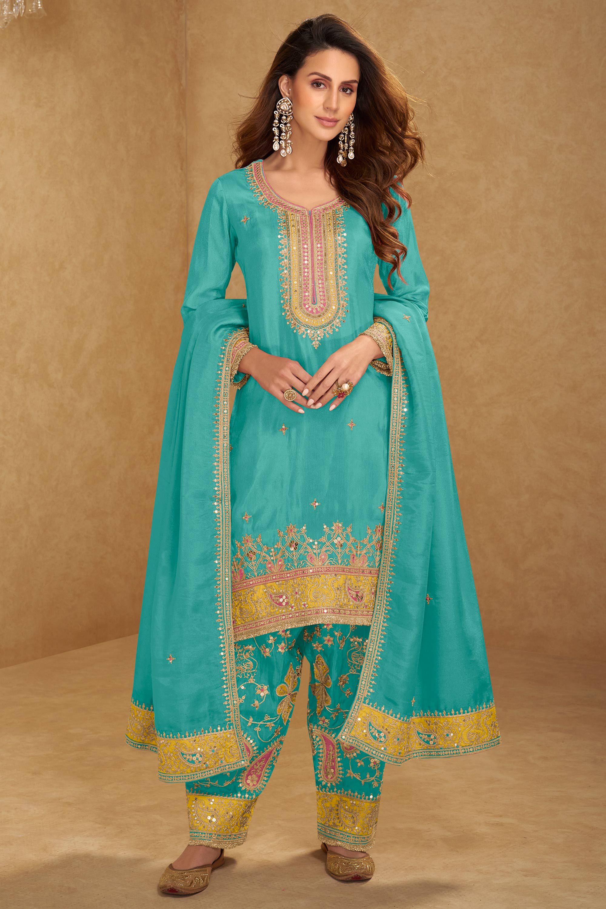 Cyan Art Silk Fancy Embroidered Function Wear Readymade Designer Salwar Suit