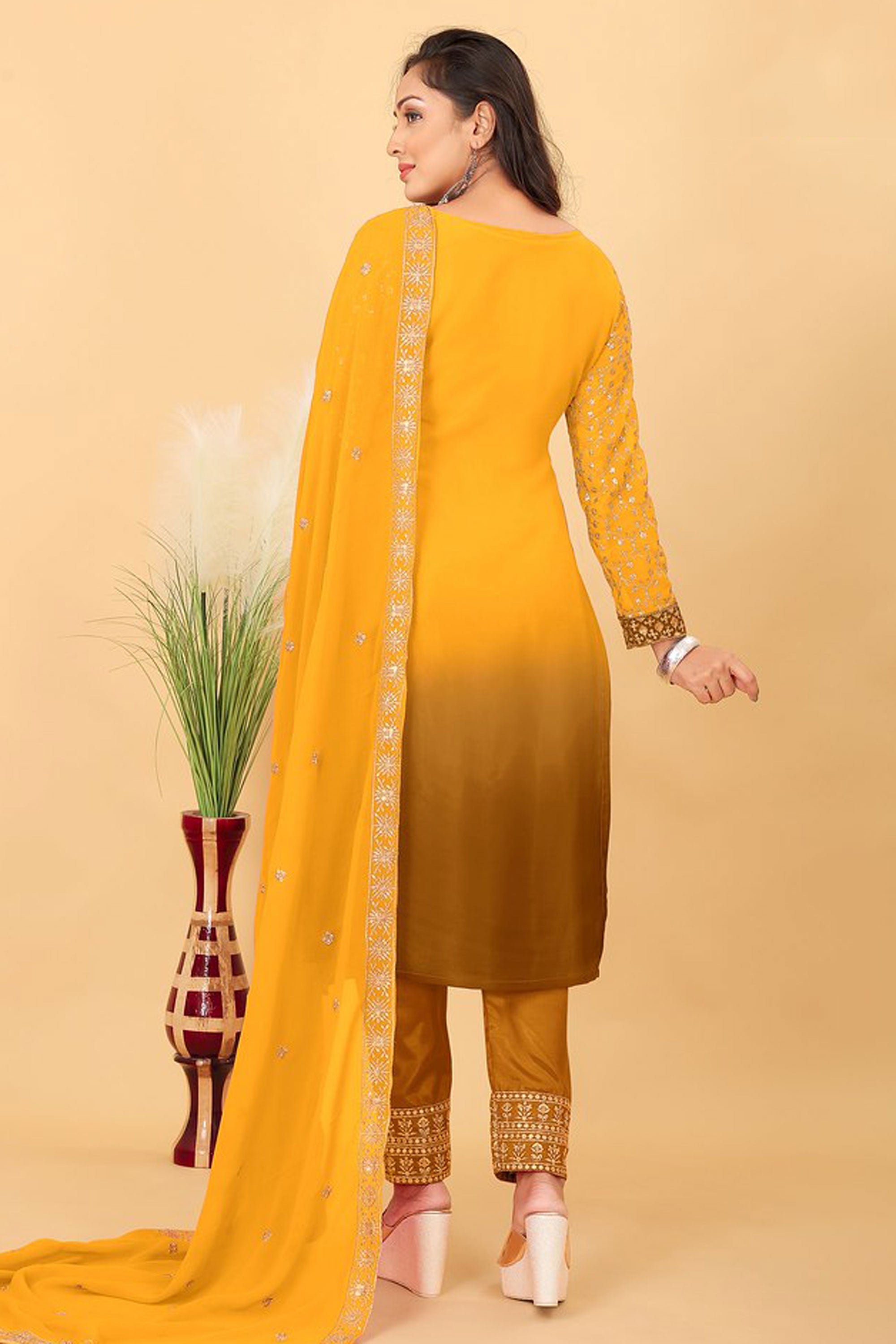 Embroidered Georgette Mustard Readymade Straight Cut Suit