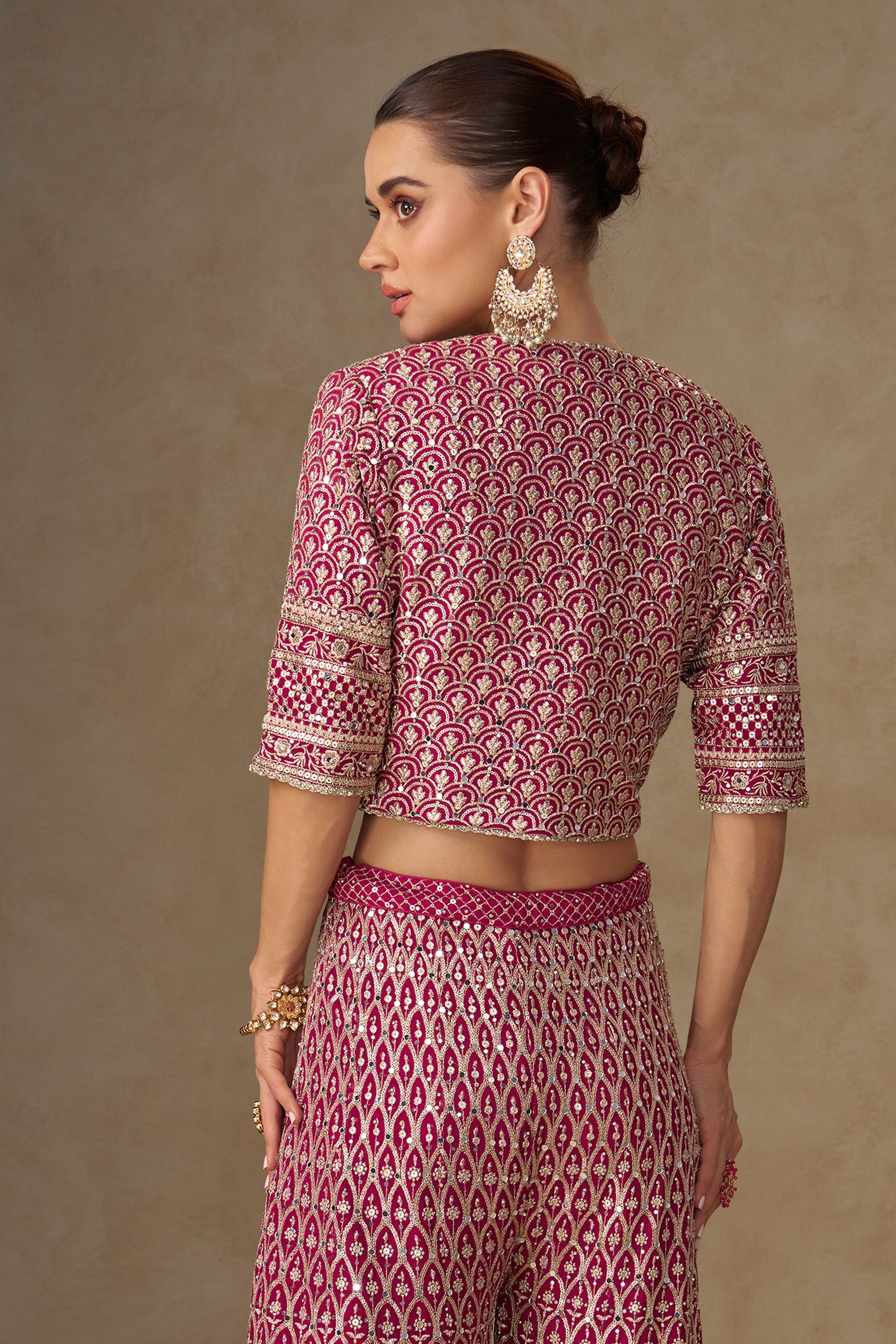 Georgette Magenta Embroidered Readymade Indo Western Palazzo With Short Top And Jacket