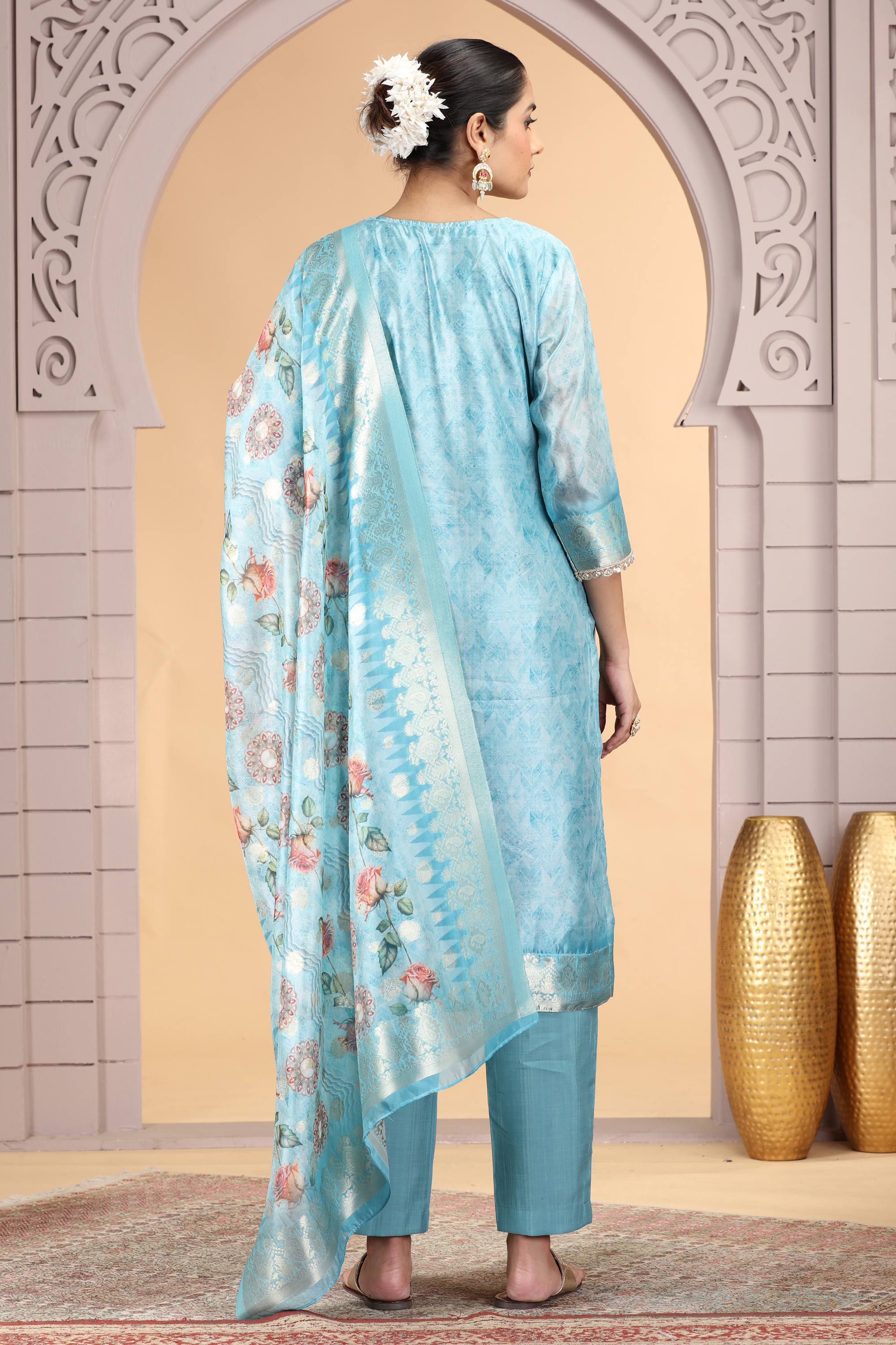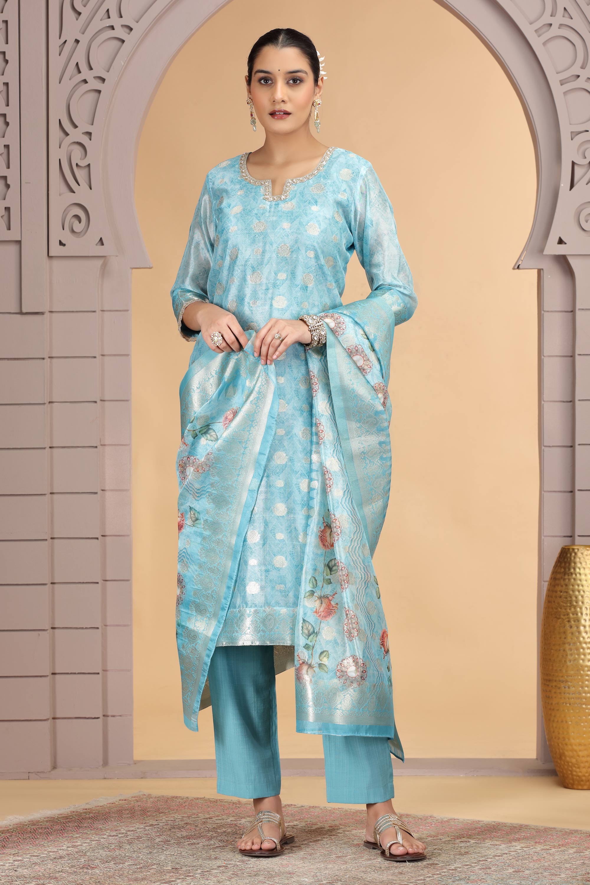 Sky Blue Readymade Designer Salwar Kameez With Jacquard Dupatta