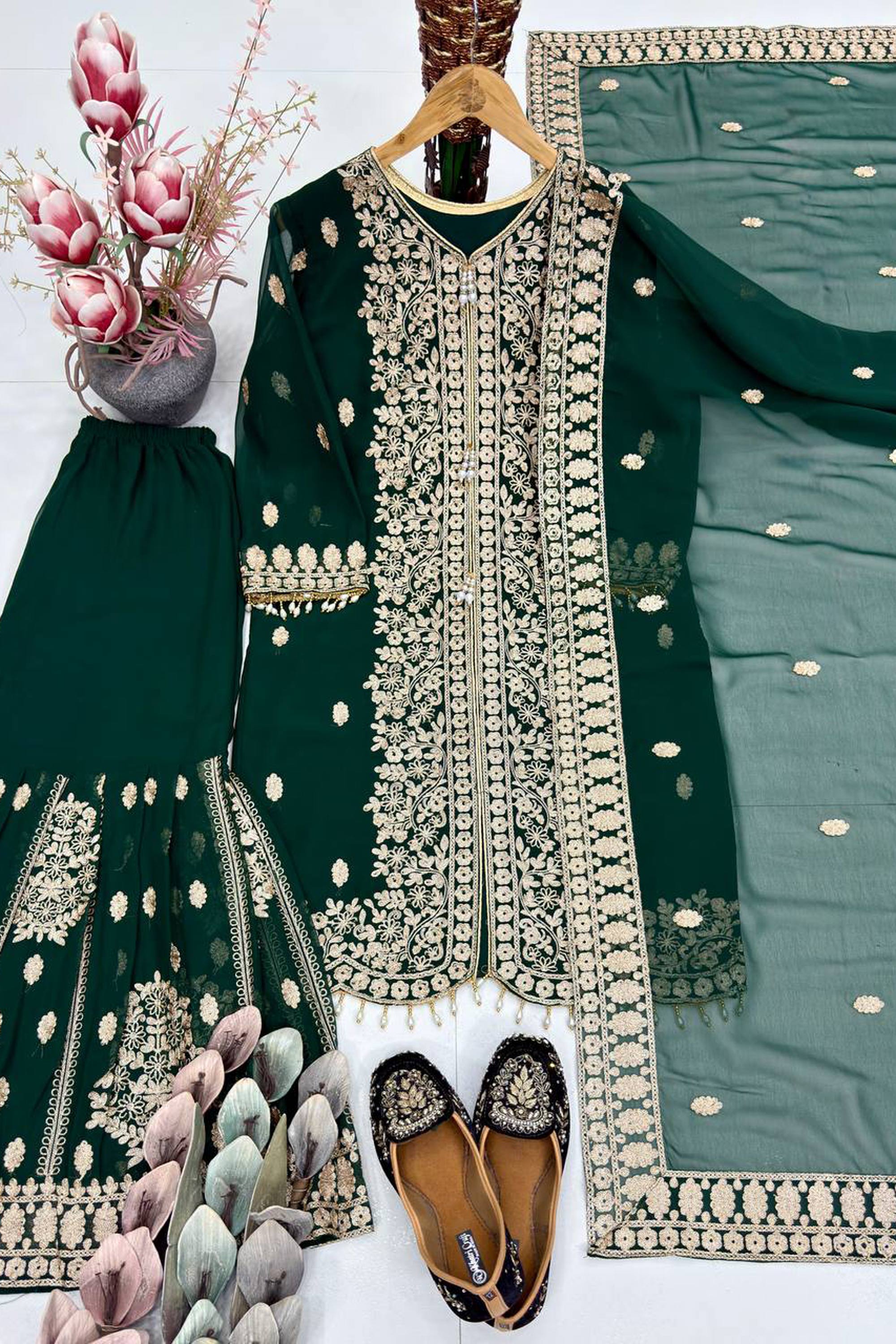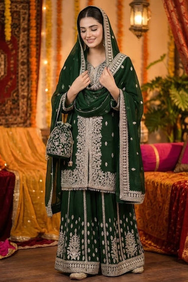 Georgette Fabric Dark Green Readymade Palazzo Suit For Function Wear