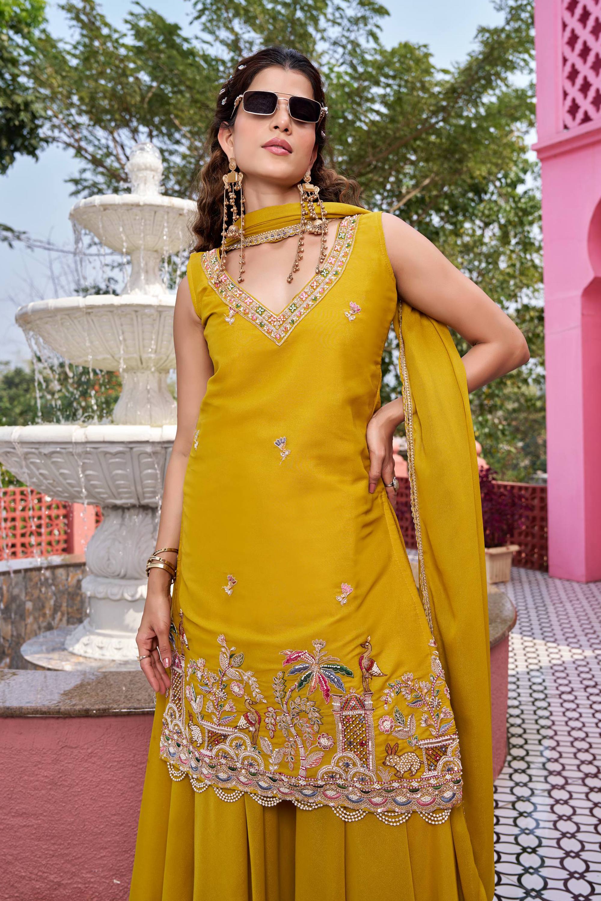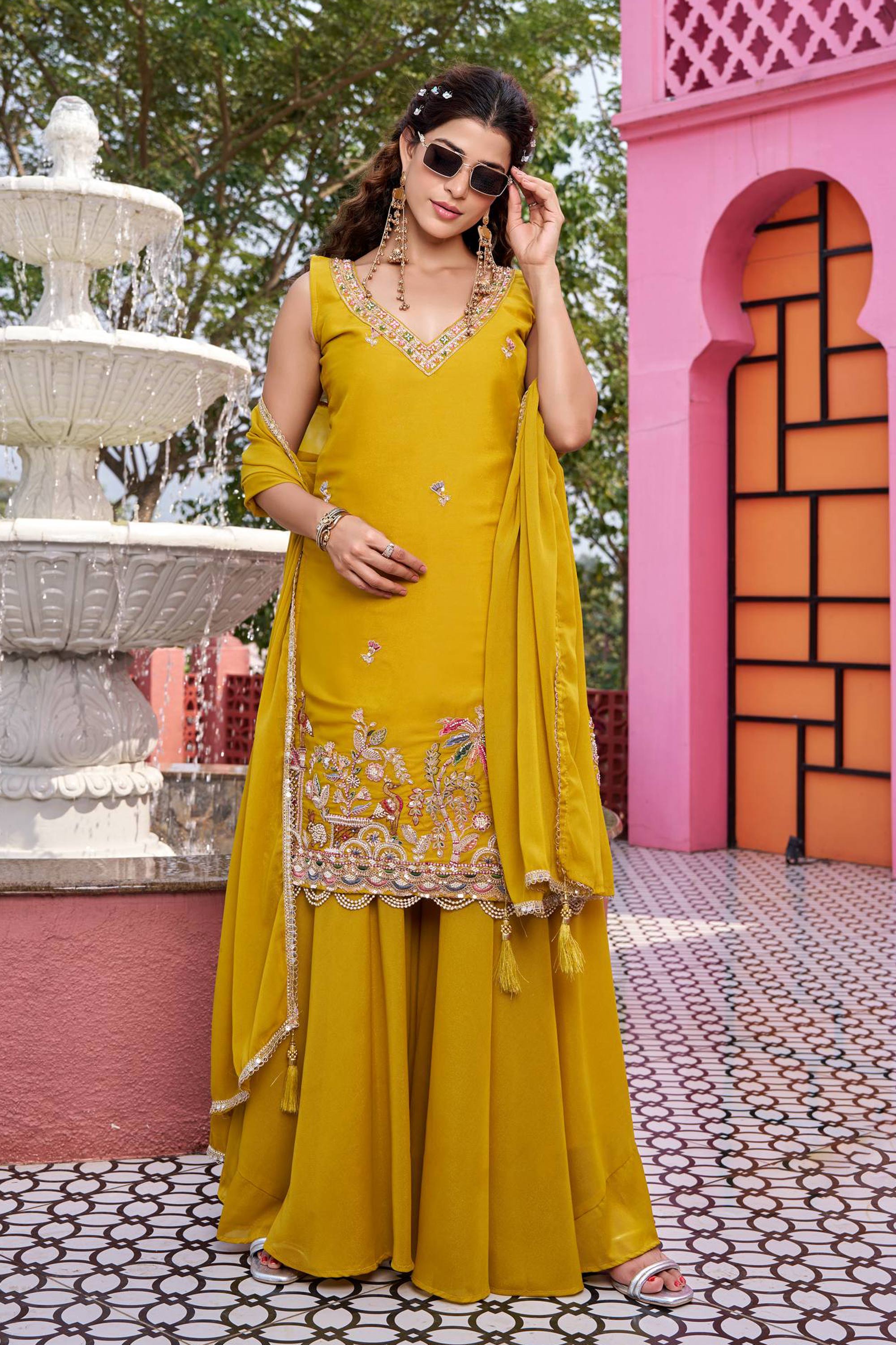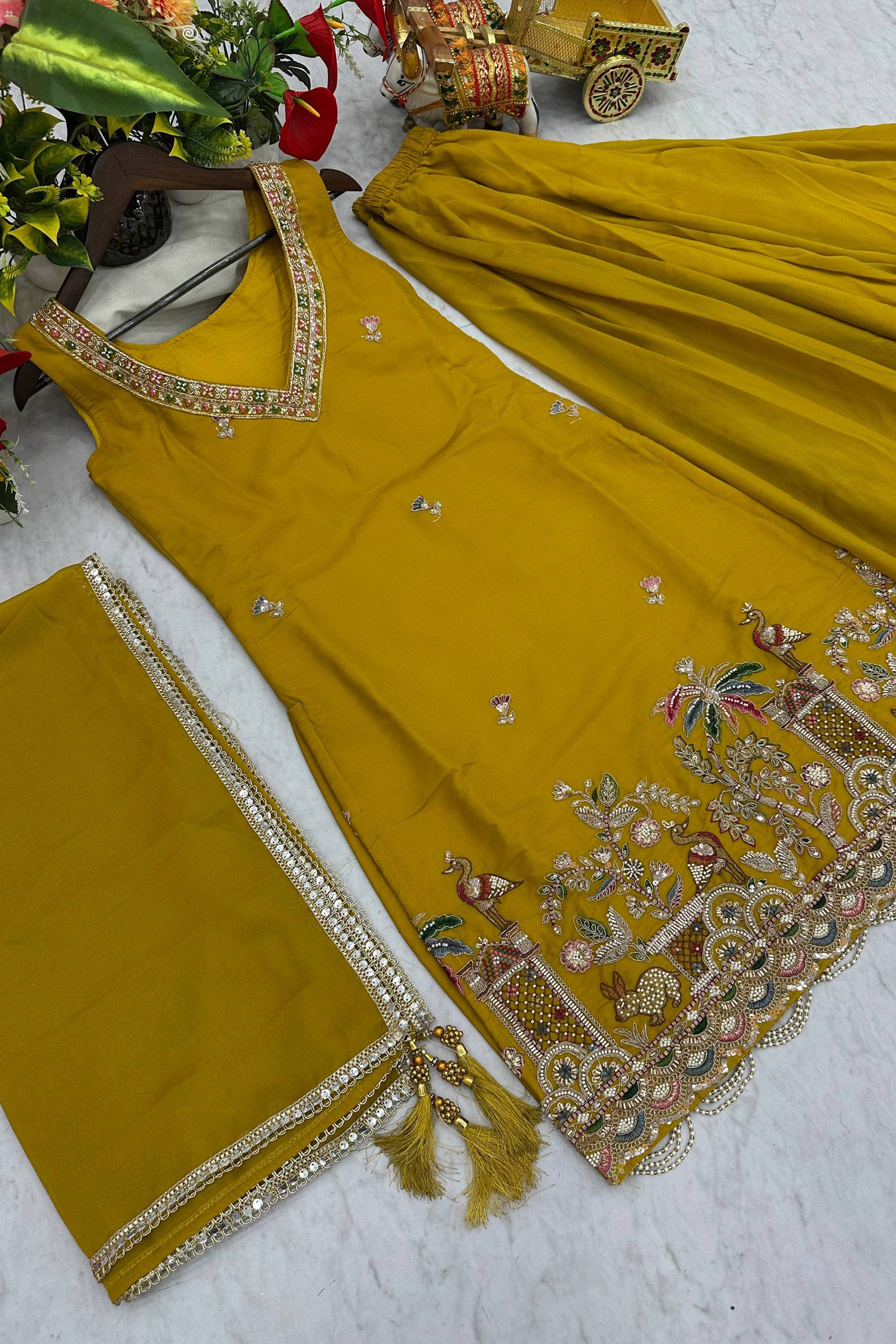 Mustard Sangeet Wear Georgette Embroidered Readymade Palazzo Suit